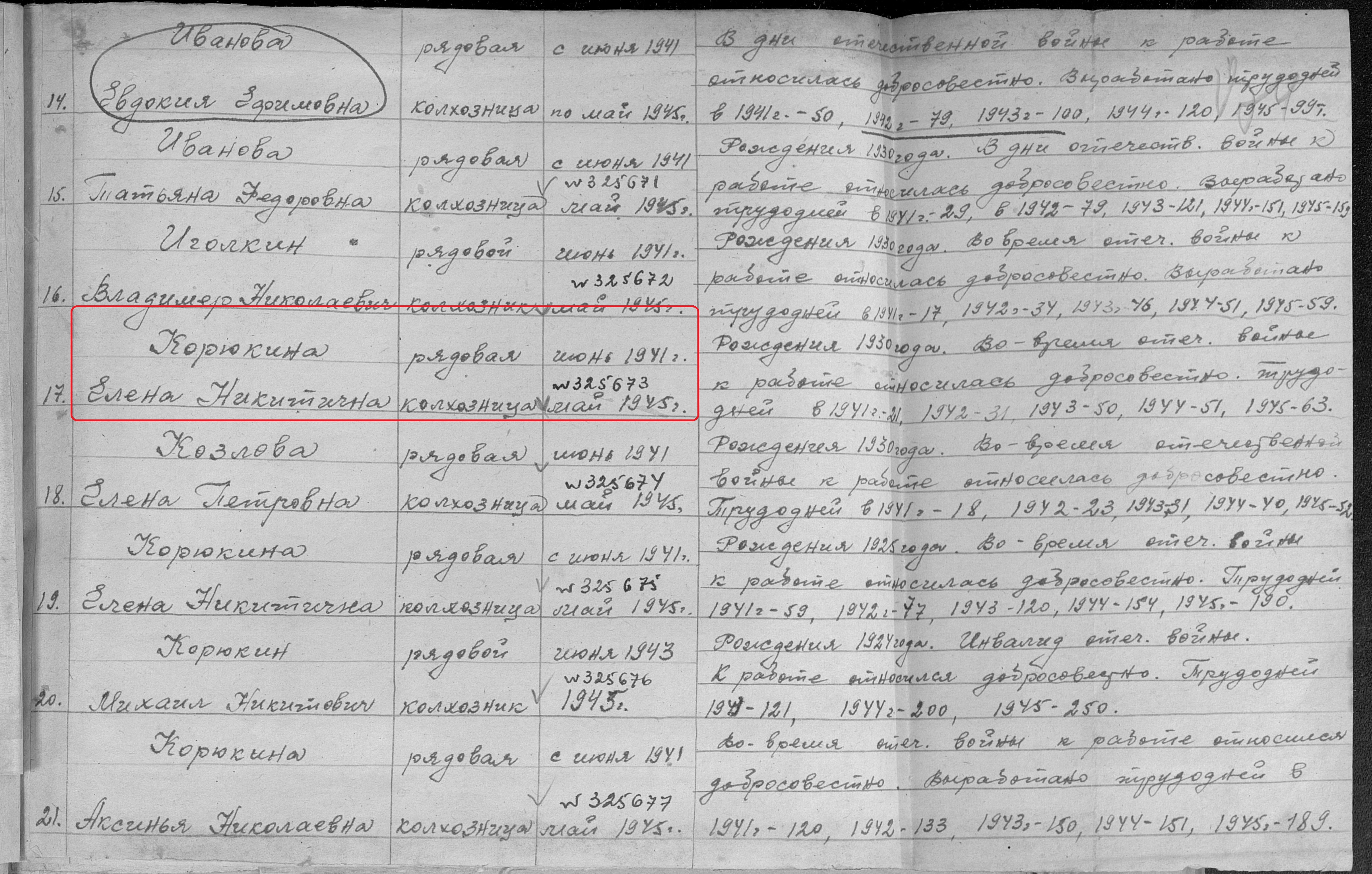 Корюкина Елена Никитична родилась в 1929 году. Место жительства: с.Новошешминск Ново-Шешминский район ТАССР. В годы Великой Отечественной войны работала в колхозе им. Чкалова рядовой колхозницей. Награждена медалью "За доблестный труд в Великой Отечественной войне 1941–1945 гг." (Акт от 01.1946 г., фонд 3610, опись 2, дело № 470, АК № 325671). Умерла в 2012 году, похоронена на сельском кладбище с.Новошешминск.