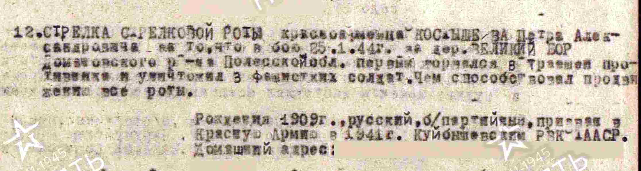 КОСТЫШЕВ Пётр Александрович, 1909, с. Большие Полянки. Мобилизован Куйбышевским РВК ТАССР в 1941. С июля 1942 воевал на Сталинградском, Центральном, Брянском, Белорусском, 1, 2 и 3 Белорусском фронте в составе 1 ТА/ 64 А/ 48 А/ 50 А/ 3 А. Красноармеец/ сержант, стрелок/ ком. отделения транспортной роты 1348 СП 399 СД. Участник битвы под Сталинградом и на Курской дуге, освобождения Белоруссии, Польши, боёв Вост. Пруссии. Награждён медалью «За боевые заслуги», орденами Красной Звезды, Отечественной войны 2 ст. (1988).