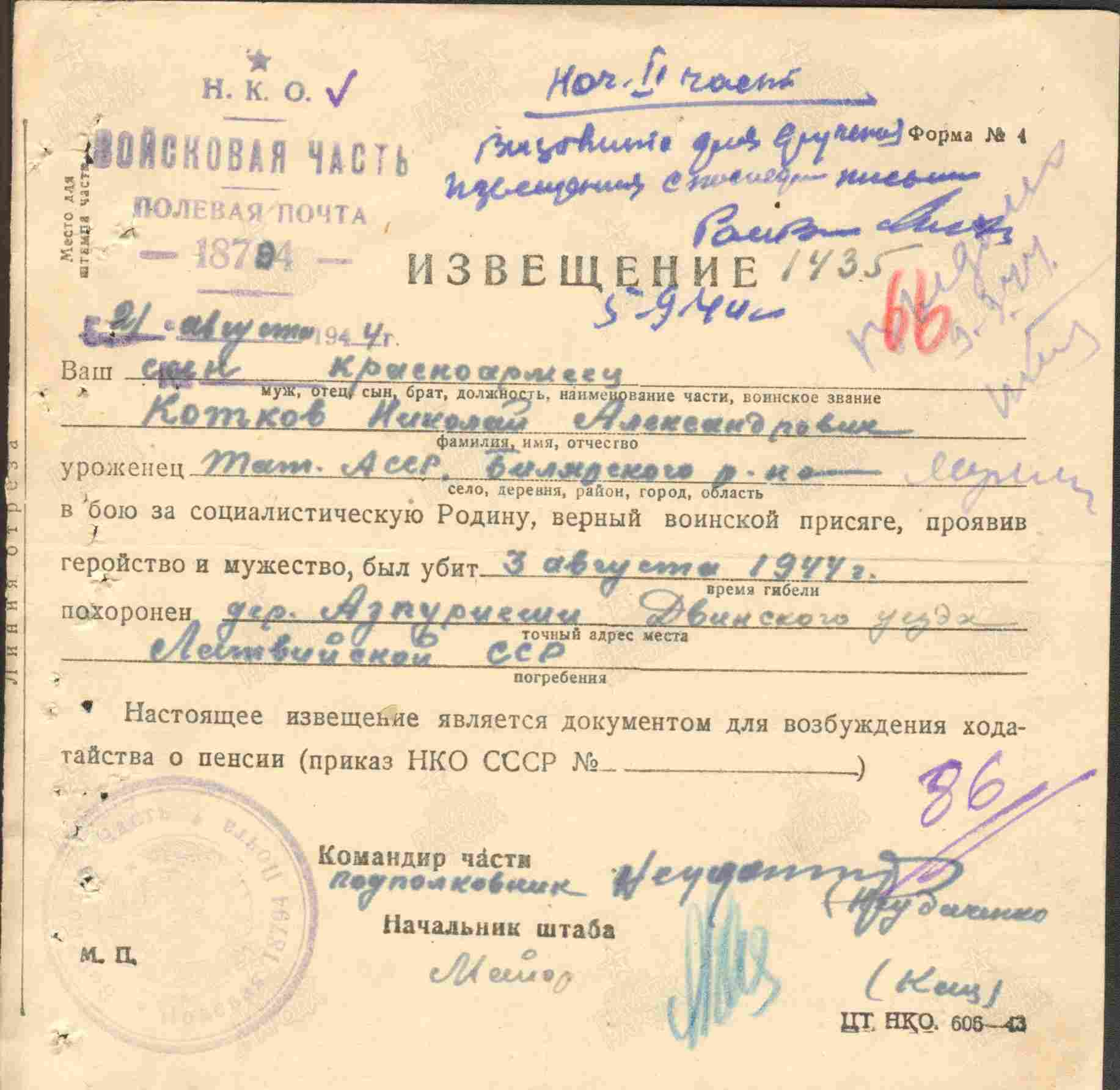 КОТКОВ Николай Александрович, 1926, д. Старое Муллино. До призыва в армию работал в к-зе «МОПР». Мобилизован Билярским РВК 26 окт. 1943. Красноармеец, стрелок 642 СП 200 СД 3 УдА/ 4 УдА 2 и 1 Прибалтийского фронта. Участник освобождения Прибалтики. Погиб 3 авг. 1944, д. Азпуриеми (Айзпурве?), ЛатвССР.