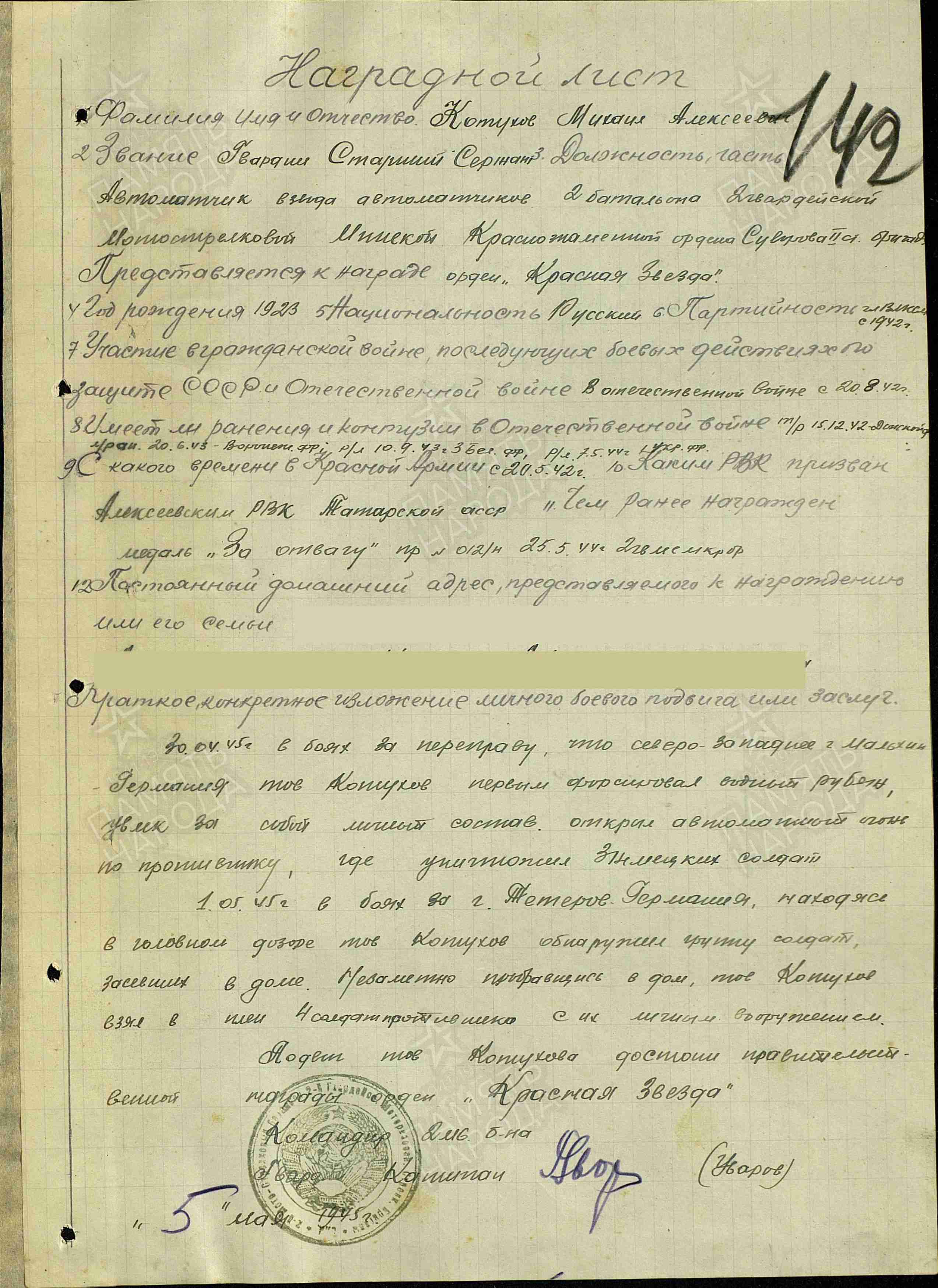 КОТУХОВ Михаил Алексеевич, 1923, с. Лебяжье. До призыва в армию работал трактористом в Алексеевской МТС. Мобилизован 22 мая 1942 Алексеевским РВК. Член ВЛКСМ. В боях с 20 авг. 1942. Красноармеец, механик-водитель танка Т-34 181 ТБр 18 ТК 60 А Воронежского/ Юго-Западного фронта. Тяжело ранен в лев. ногу 28 дек. 1942. Проходил лечение в ЭГ 999, г. Ульяновск, до мая 1943. В последующих боях перенёс три лёгких ранения: 20 авг. 1943, 10 сент. 1943, 2 мая 1944 (ЭГ 1978, ст. Палатовка, Белгородская обл.). Участвовал в битве на Курской дуге. Гв. красноармеец/ гв. ст. сержант, автоматчик, зам. ком. взвода 2 гв. МСБр 3 гв. ТК 4 гв. А Воронежского/ 2 Украинского фронта, 5 гв. ТА 3 Белорусского/ 1 Прибалт./ 2 Белорусского фронта. Демобилизован 15 нояб. 1945. Награждён медалью «За отвагу», орденом Красной Звезды. Работал автослесарем на Алексеевском МКК. Член КПСС с 1966.