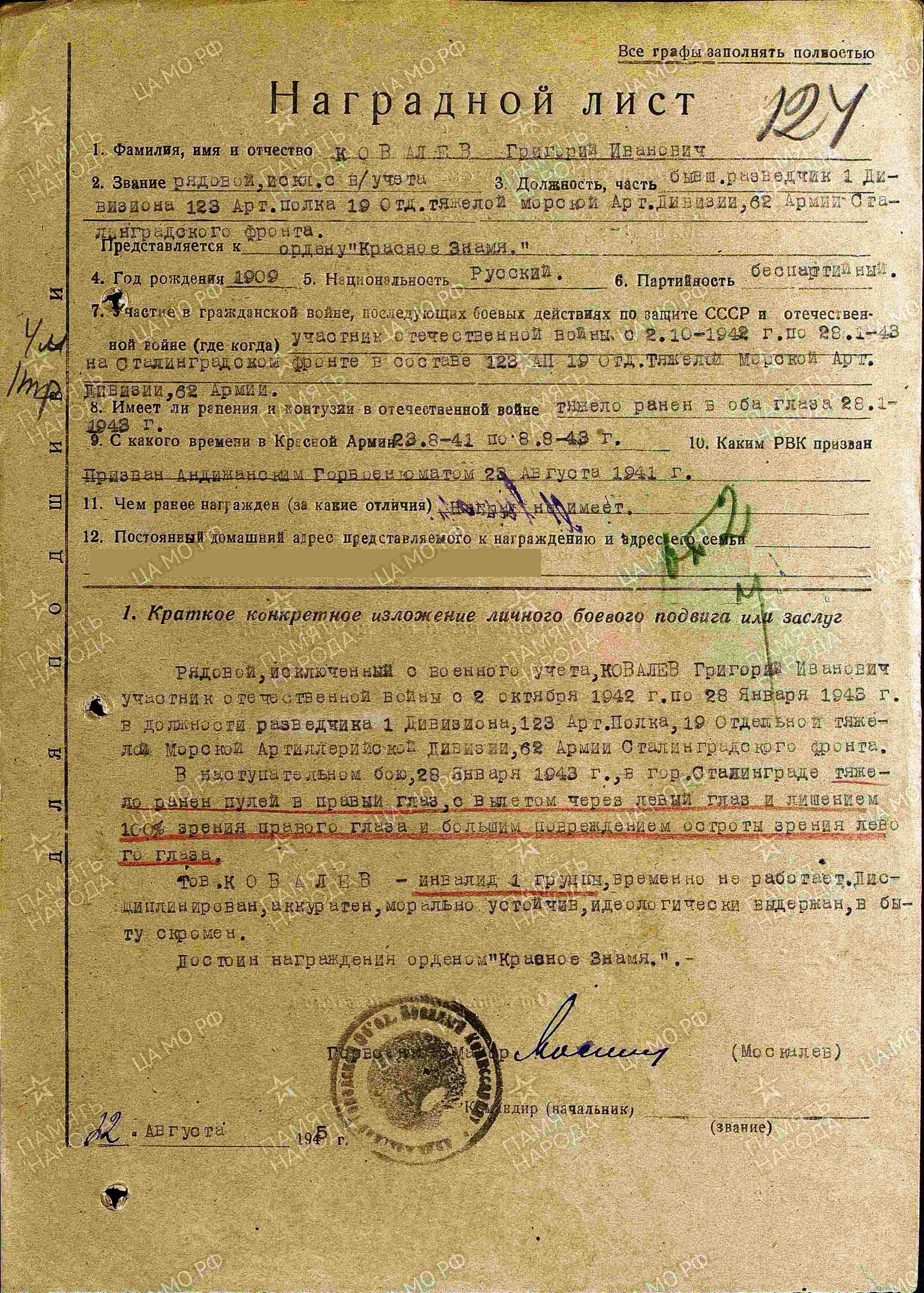КОВАЛЁВ Григорий Иванович, 1909, д. Николаевка. Мобилизован 23 авг. 1941 Андижанским ГВК Ферганской обл. УзбССР. Служил в САВО, в группе советский войск в Иране. С окт. 1942 направлен под Сталинград. Красноармеец, разведчик дивизиона 123 арм. АП 19 тяж. АД 64 А Донского фронта. 28 янв. 1943, в боях за г. Сталинград, тяжело ранен пулей в прав. глаз с вылетом ч/з лев. глаз с лишением 100% прав. глаза и значительным повреждением остроты зрения лев. глаза. Проходил лечение в ЭГ 1658, г. Чкалов (Оренбург). Демобилизован по инвалидности 1 гр. 8 авг. 1943. В 1947, по ходатайству РВК, награждён орденом Красной Звезды.
