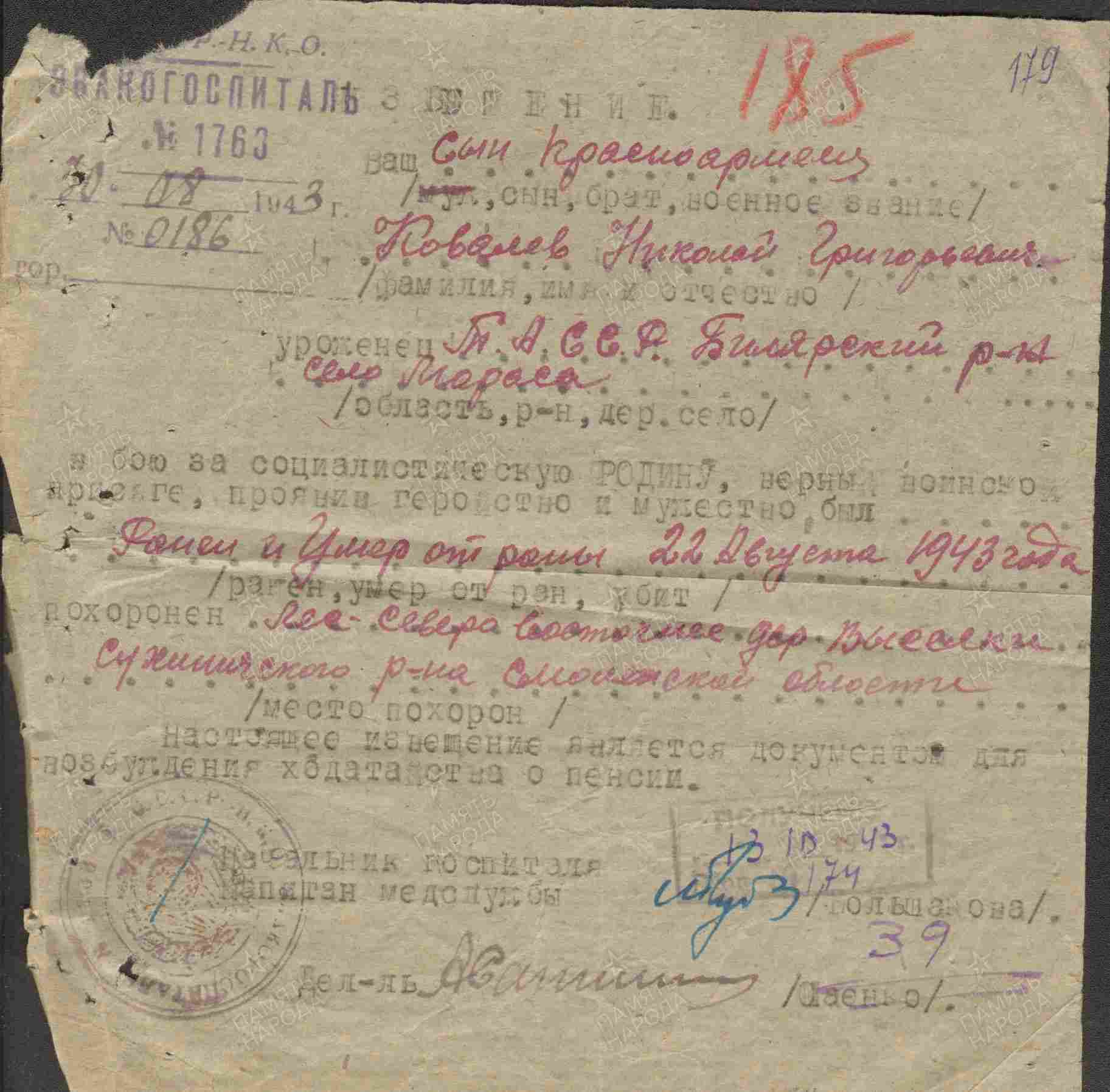 КОВАЛЁВ Николай Григорьевич, 1905, с. Русская Мараса. Мобилизован Чугуевским РВК Приморского края. В 1943 – красноармеец, стрелок 680 СП 169 СД 11 гв. А Западного фронта. 1 июля 1943 получил тяжёлое слепое осколочное ранение правой затылочно-теменной области с обширным повреждением кости с выпадением мозгового вещества. Умер 22 авг. 1943 в ЭГ 1763, д. Выселки, Сухиничский р-н, Калужская обл.
