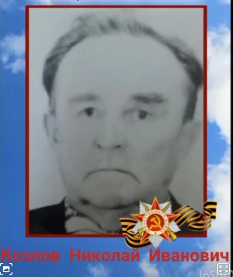 Козлов Николай Иванович родился 04 августа 1921 года. Призван на военную службу по мобилизации Новошешминским РВК в ноябре 1941 года. Прошел всю войну. Дошел до Берлина. Принимал участие в боях за Кавказ, за города Европы, за Берлин, за Кёнигсберг. Награжден многими медалями, орденом Красной звезды. Имеет ранения в руки, ноги, контузию, осколочное в спину и осколочное в лицо, после которого было потеряно обоняние.