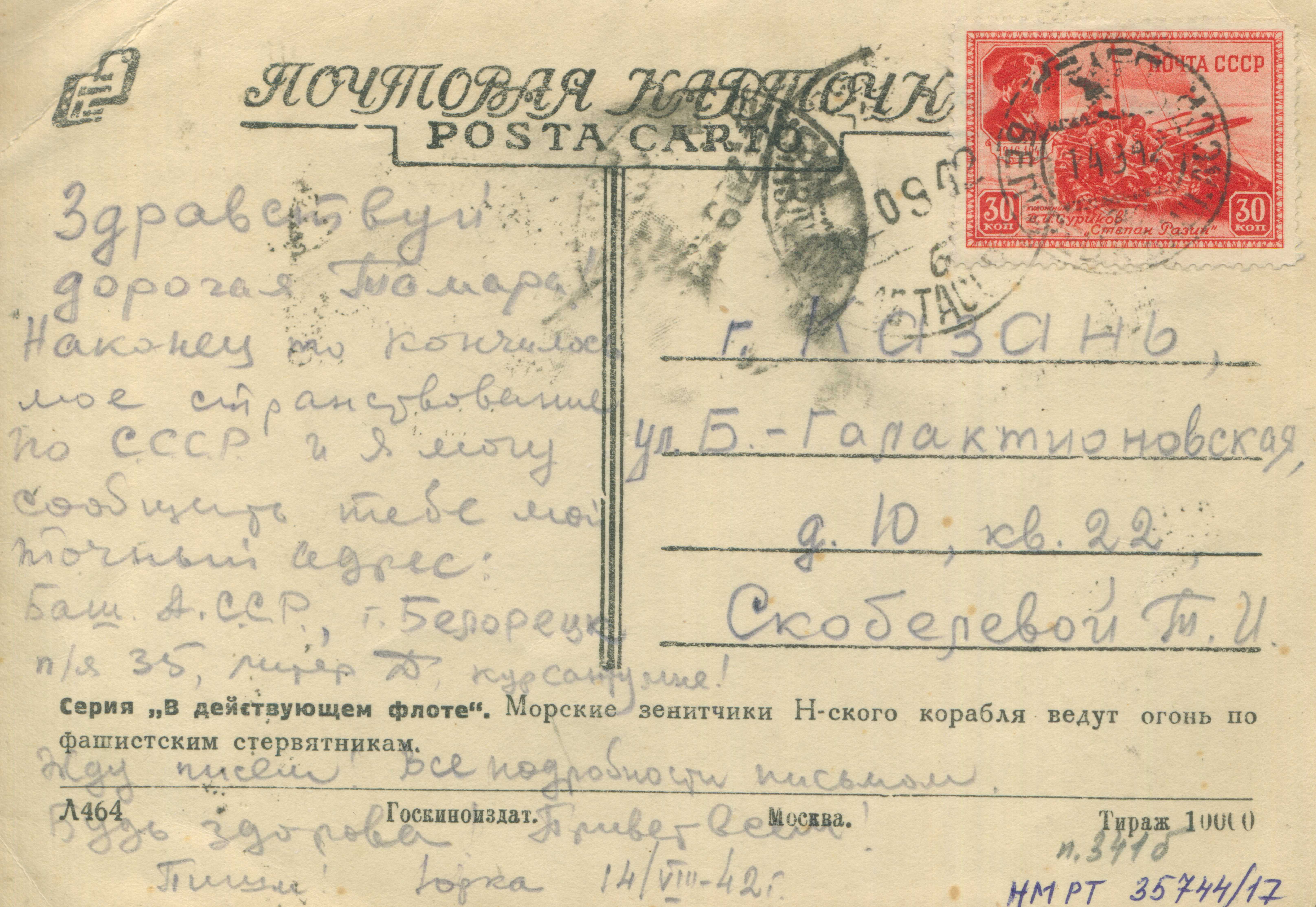 Жду писем. Все подробности письмом. Будь здорова. Привет всем! Пиши. Юрка. 14.VIII.-42 г.