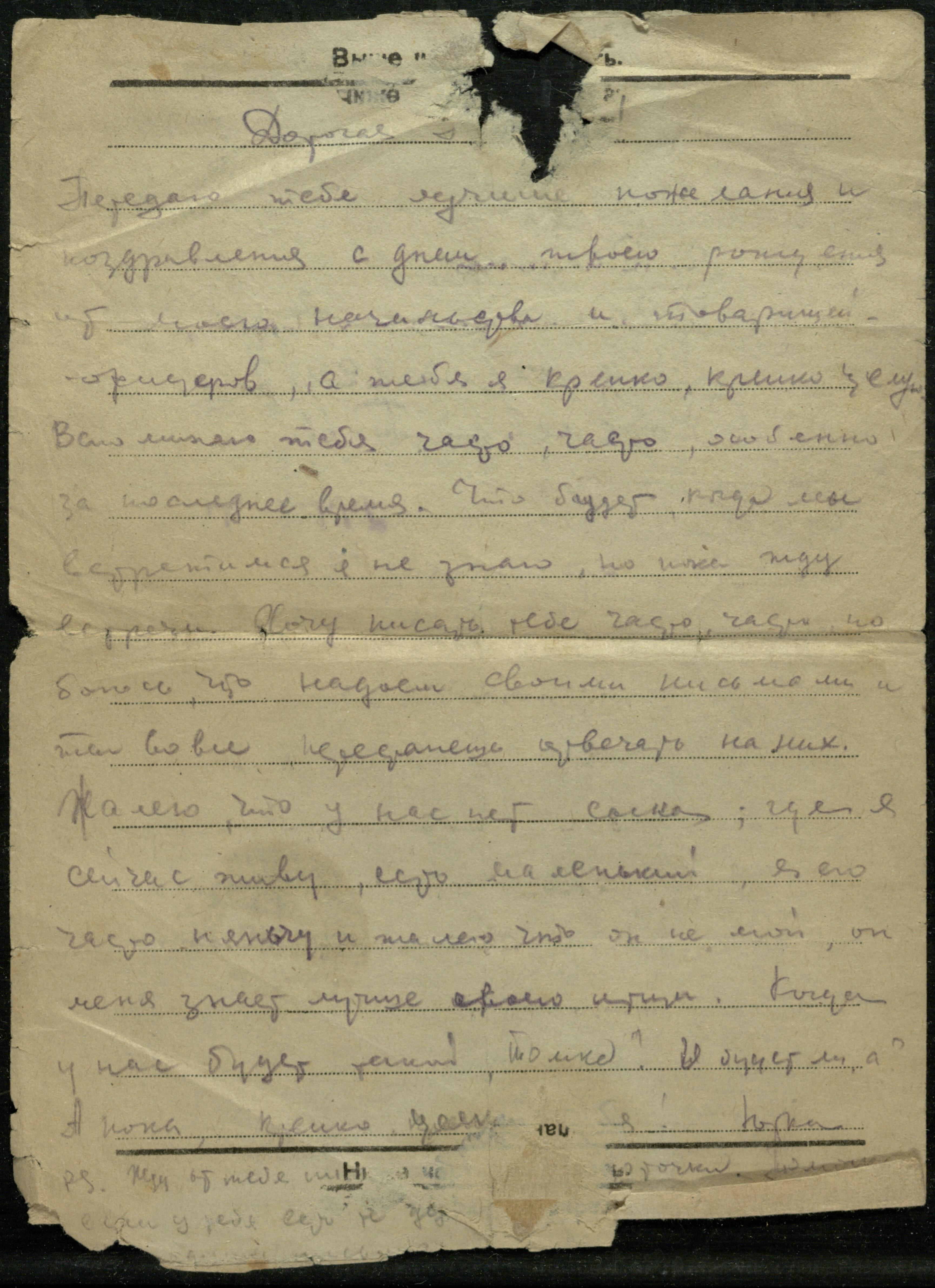 Р.S. Жду от тебя письма и фотокарточки. Томочка, если у тебя есть (написано не разборчиво- духи, которыми ты душилась раньше…).
