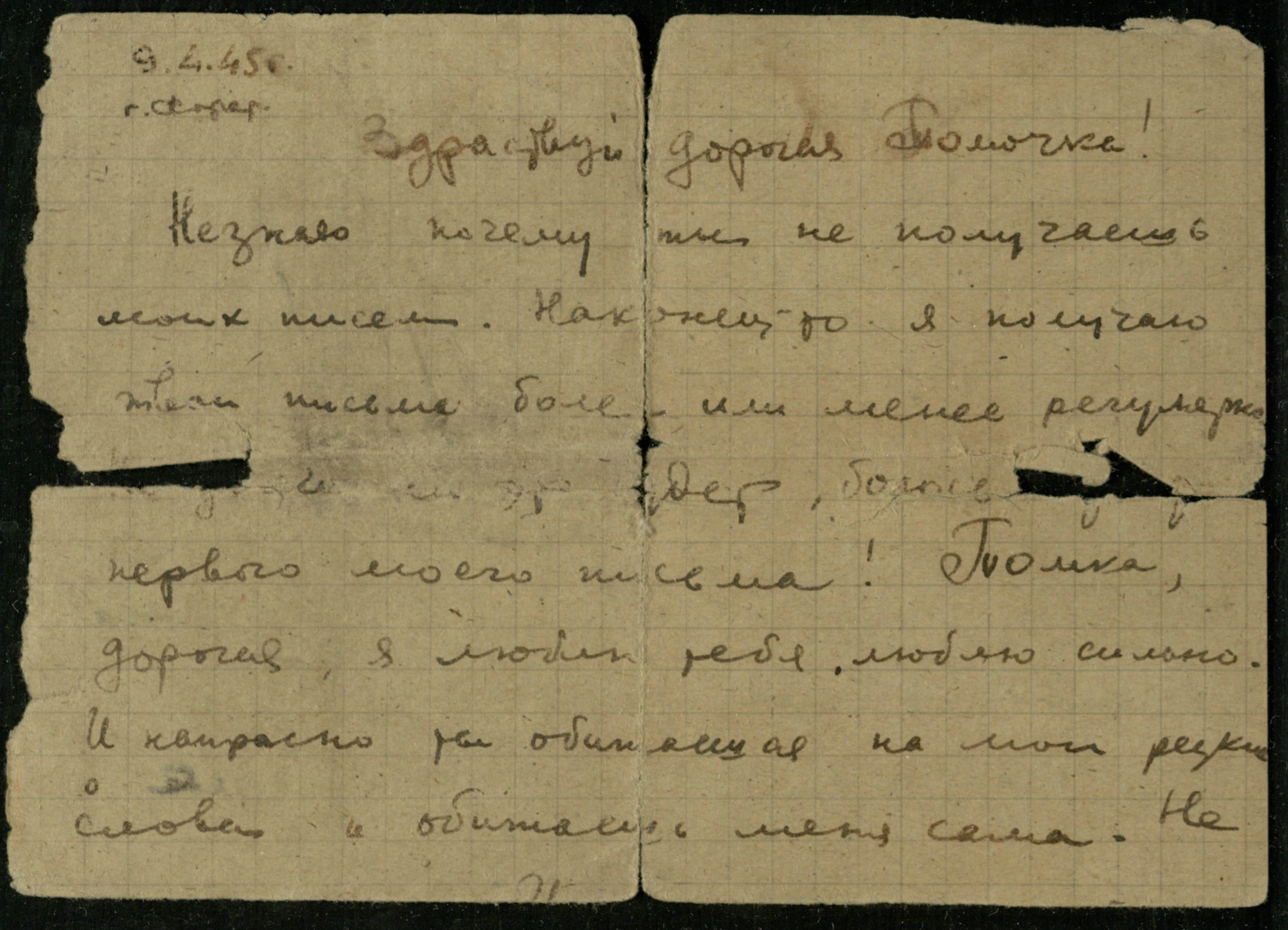 Не знаю почему ты не получаешь моих писем. Наконец-то я получаю твои письма более или менее регулярно. Н (строчка письма истерлась…)боюсь (…) первого моего письма! Томка, дорогая, я люблю тебя, люблю сильно. И напрасно ты обижаешься на мои резкие слова и обижаешь меня сама. Не к чему это. И зачем ты так официально ко мне относишься? Мне это немножко обидно, хотя знаю, что ты все в шутку. Вспоминаю наши немногие счастливые дни, наши скупые ласки, и в этом (слово стерлось) виновата ты, говорю это не в упрек тебе. Да, прошлое не вернется, Томка, а года идут. И все остальные мысли твои повторяют мои мысли. Все это (…) абсолютно (…). И об одном только прошу тебя, дорогая Томка, если я погибну, а это в порядке вещей, так пусть твоя жизнь будет счастлива, так как она будет (…) очень дорогой ценой, ценой крови. Это счастье будет мой последний дар тебе. Береги его. А если я останусь жив, то мы должны быть счастливы, так как это счастье куплено дорогой ценой.
