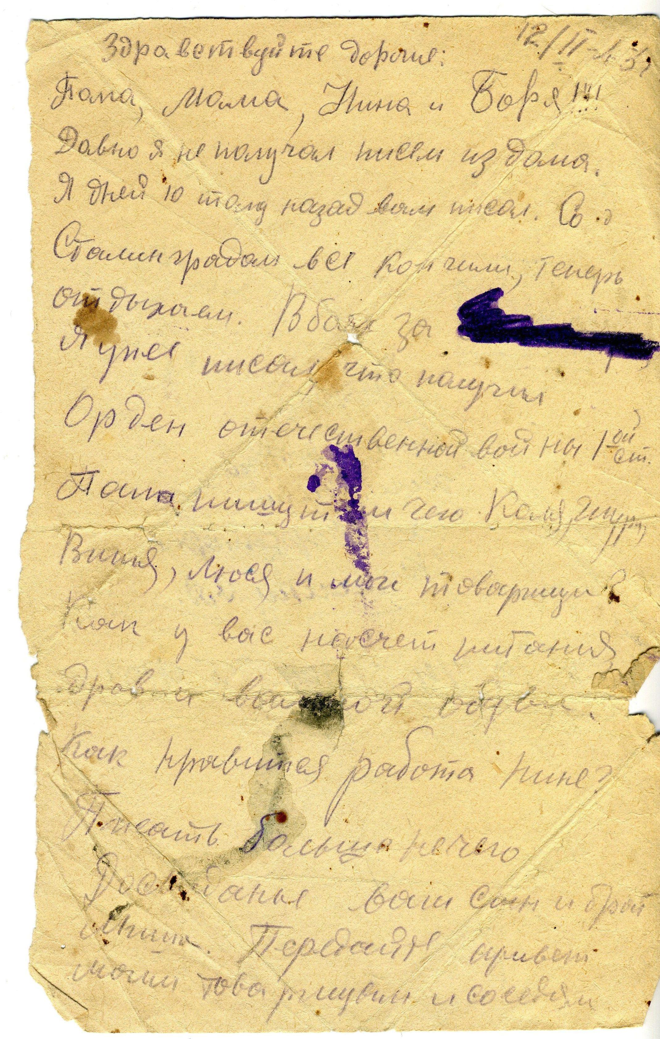 Давно я не получал писем из дома. Я дней 10 тому назад вам писал. Со Сталинградом все кончили, теперь отдыхаем. В боях за (слово вымарано) я уже писал, что получил орден Отечественной войны 1-й степени. Папа, пишут ли чего Коля, Шура, Витя, Люся и мои товарищи. Как у вас насчет питания, дров и валяной обуви? Как нравится работа Нине? Писать больше нечего. Досвиданья. Ваш сын и брат Миша. Передайте привет моим товарищам и соседям.