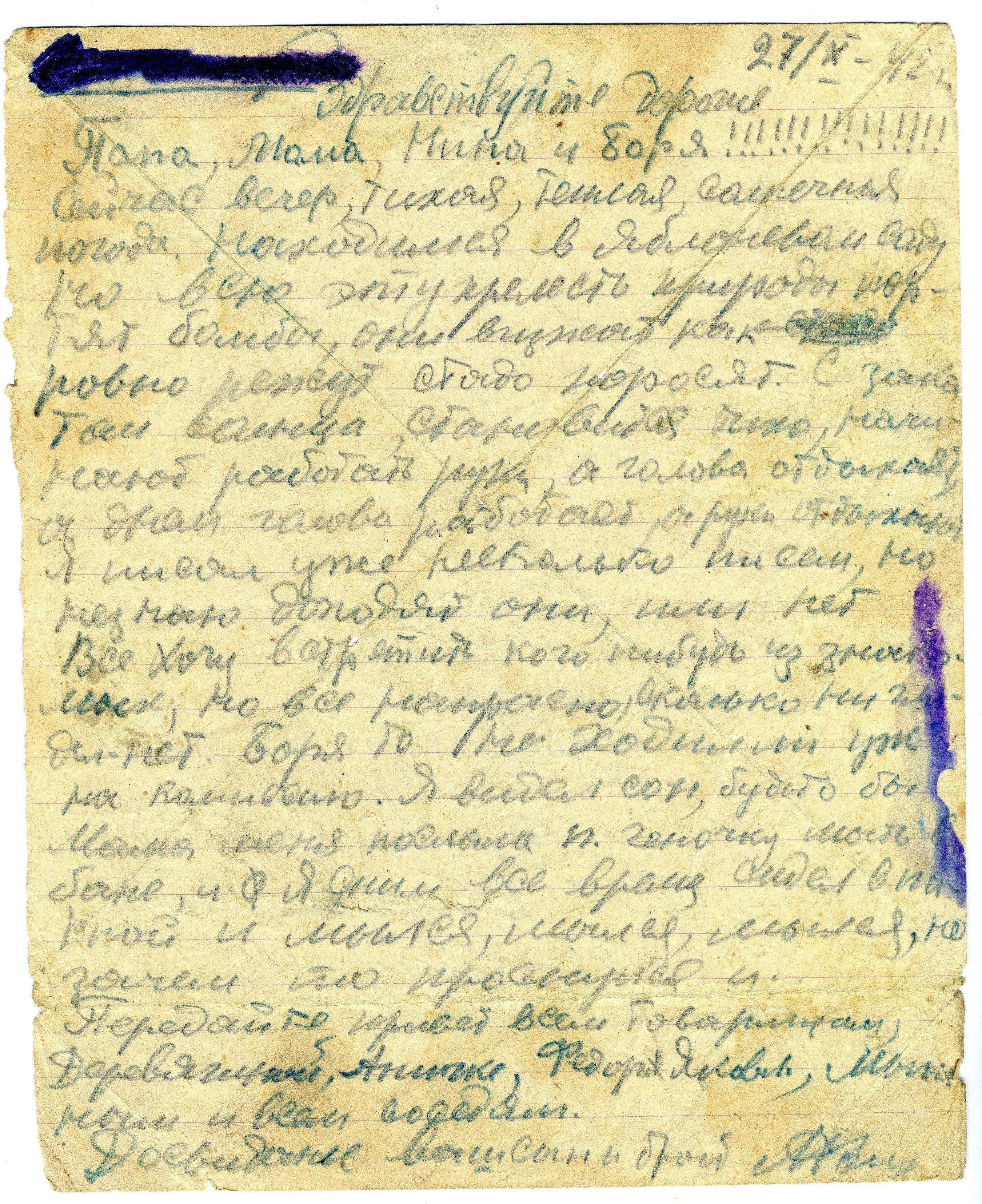 Сейчас вечер, тихая, теплая, солнечная погода. Находимся в яблоневом саду. Но всю эту прелесть природы портят бомбы, они визжат как ровно режут стадо поросят. С закатом солнца становится тихо, начинают работать руки, а голова отдыхает, а днем голова работает, а руки отдыхают. Я писал уже несколько писем, но не знаю, доходят ли они или нет. Все хочу встретить кого-нибудь из знакомых, но все напрасно, сколько ни глядел – нет. Боря-то не ходил ли уж на комиссию. Я видел сон, будто бы мама меня послала п. Геночку мыть в бане, и я с ним все время сидел в парной и мылся, мылся, но зачем-то проснулся и …