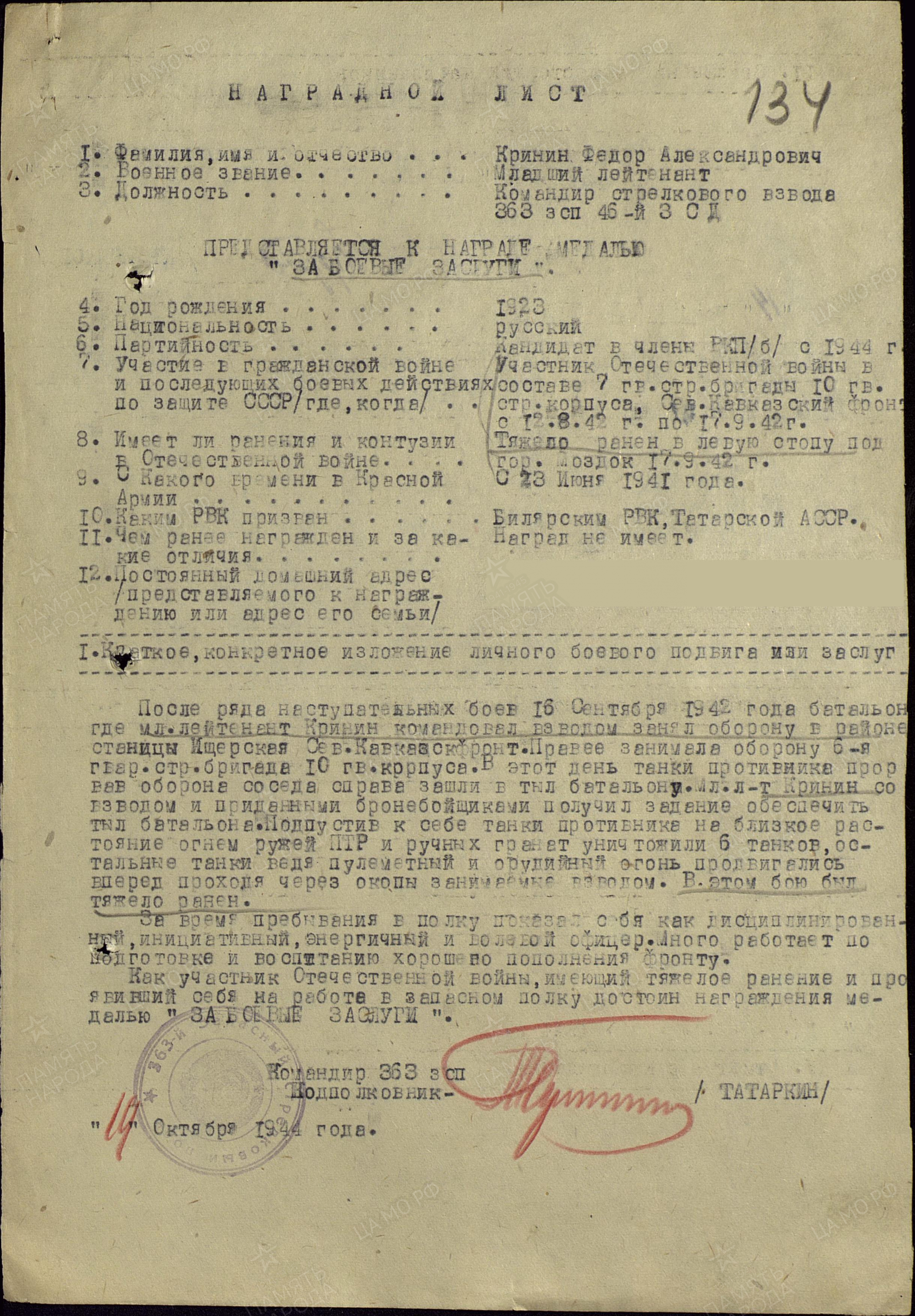 КРИНИН Фёдор Александрович, 1923, с. Алексеевское. Член ВЛКСМ/ с 1944 – канд. ВКП(б). Мобилизован 23 июня 1941 Билярским РВК. Прошёл подготовку в воздушно-десантных частях в Московском ВО, 3 маневренная ВДБр, окончил курсы мл. лейтенантов. С 1942 – гв. мл. лейтенант, ком. взвода 7 гв. СБр 10 гв. СК Закавказского и Северо-Кавказского фронта. Тяжело ранен в левую стопу в боях за г. Моздок 17 сент. 1942. После излечения – ком. взвода 363 ЗСП 46 ЗСД, в дальнейшем продолжил службу кадровым офицером. Вышел в отставку в звании «капитан интендантской службы». Награждён медалью «За оборону Кавказа», двумя орденами Красной Звезды (1946, 1976), орденом Отечественной войны 2 ст. (1985).