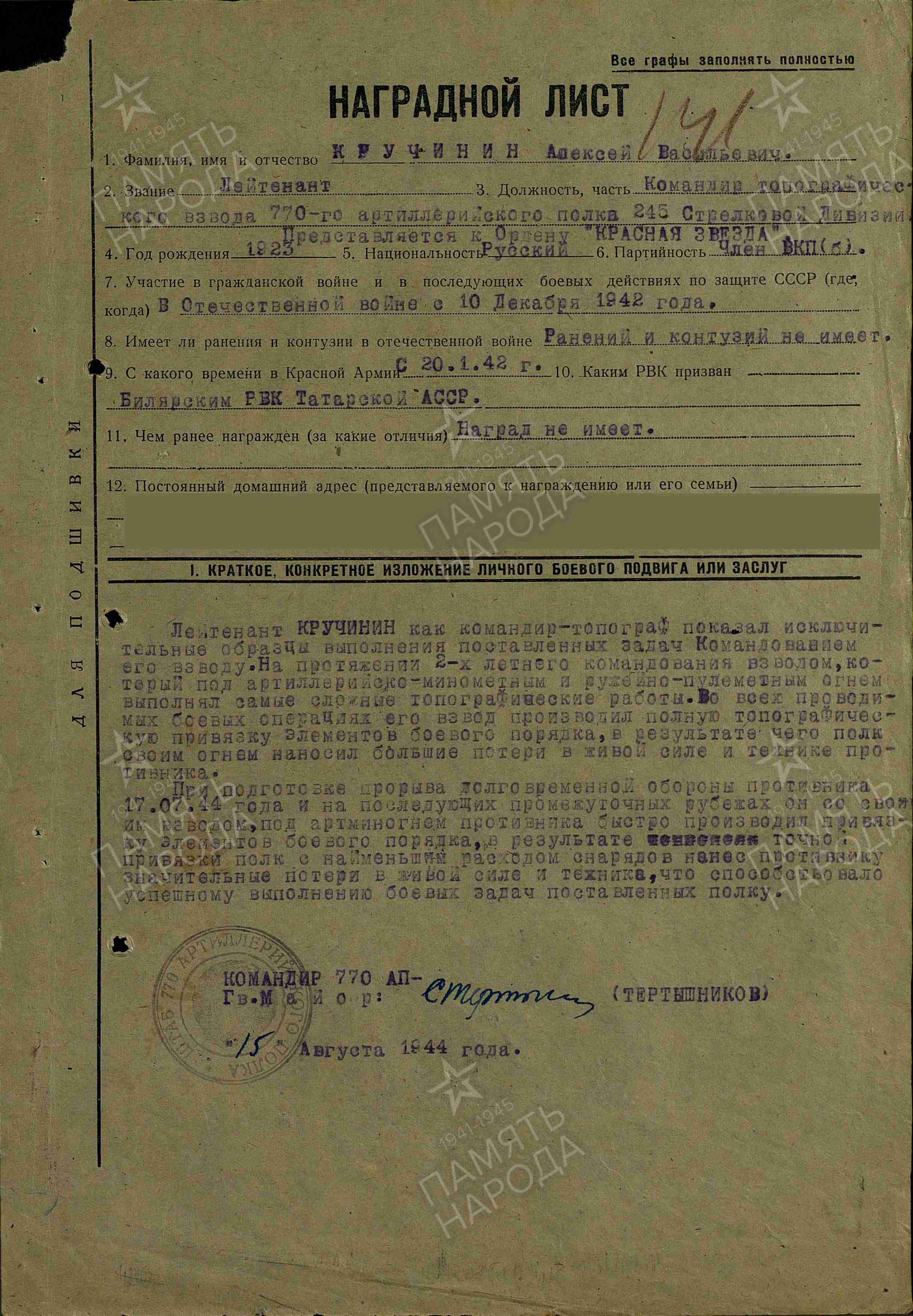 КРУЧИНИН Алексей Васильевич, 1923, с. Билярск. Мобилизован 20 янв. 1942 Билярским РВК. Окончил артиллерийское командное уч-ще. С 11 дек. 1942 воевал на Северо-Западном, 2 Прибалтийском, Ленинградском, 3 Прибалтийском, 1 Украинском фронте в составе 34 А/ 22 А/ 3 УдА/ 42 А/ 54 А/ 1 УдА/ 59 А. Член ВКП(б). Лейтенант, ком. топографического взвода 770 АП 245 СД. Участник освобождения Прибалтики, Польши. После войны продолжил службу кадровым военным. Вышел в отставку 14 окт. 1975 в звании «полковник». Награждён медалью «За боевые заслуги» (1952), орденами Красной Звезды (1944), Отечественной войны 2 ст. (1985).