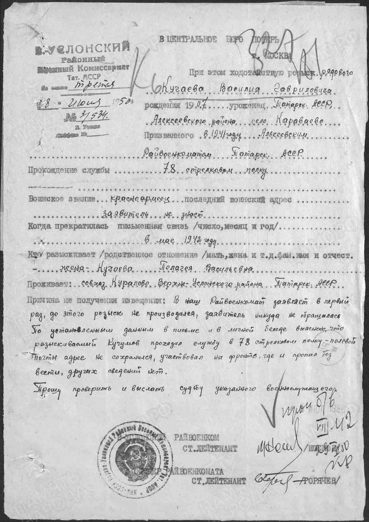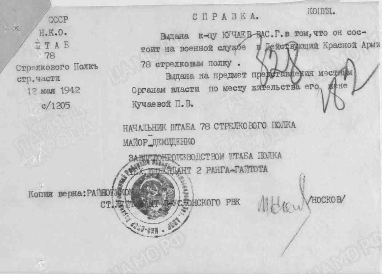 КУЧАЕВ Василий Гаврилович, 1907, с. Караваево. Мобилизован в 1941 Алексеевским РВК. Красноармеец, 78 СП 74 СД 9 А/ 12 А Южного фронта. Письменная связь с семьёй прекратилась в мае 1942. Учтён пропавшим без вести.