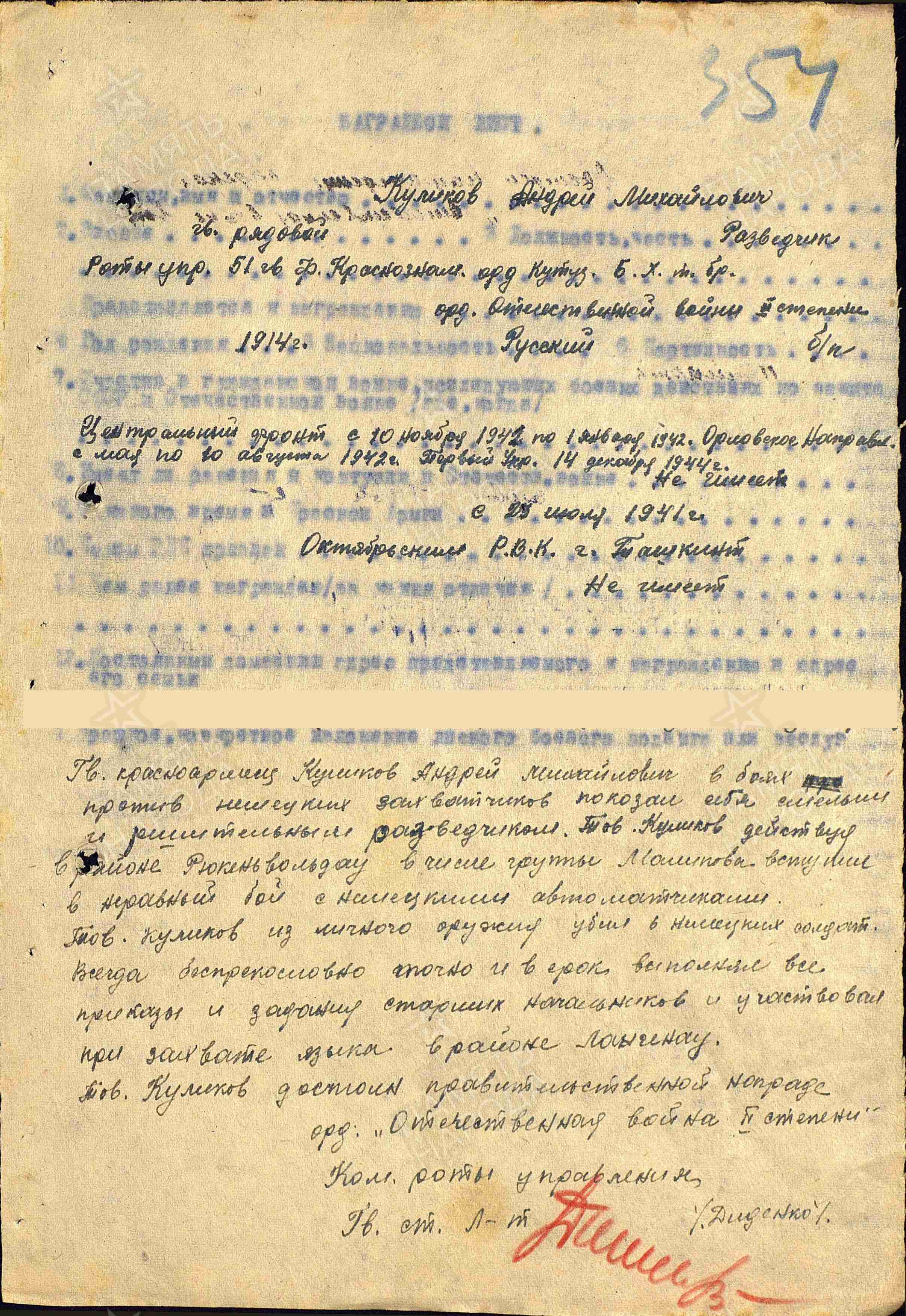 КУЛИКОВ Андрей Михайлович, 1914, с. Левашёво. Мобилизован 21 июля 1941 Октябрьским РВК г. Ташкент, УзбССР. Красноармеец. Воевал с 10 нояб. 1941 по 1 янв. 1942 на Центральном фронте, с мая по авг. 1942 — гв. мл. сержант, отд. дивизион ПТР 1 гв. КавК 16 А Западного фронта. Ошибочно учтён пропавшим без вести 12 авг. 1942 у д. Перестряги, Ульяновский р-н, Орловская (Калужская) обл. С 14 дек. 1944 — гв. красноармеец, разведчик роты управления 51 гв. ТБр 6 гв. ТК 3 гв. ТА 1 Украинского фронта. В бою у н.п. Рюкенвальдау, действуя в группе бойцов, из личного оружия уничтожил шесть немецких солдат. Участвовал при захвате «языка» в р-не н.п. Лангенау. Награждён орденом Славы 3 ст. Погиб 19 апр. 1945, д. Даммсдорф, Германия. Учтён пропавшим без вести 21 апр. 1945.