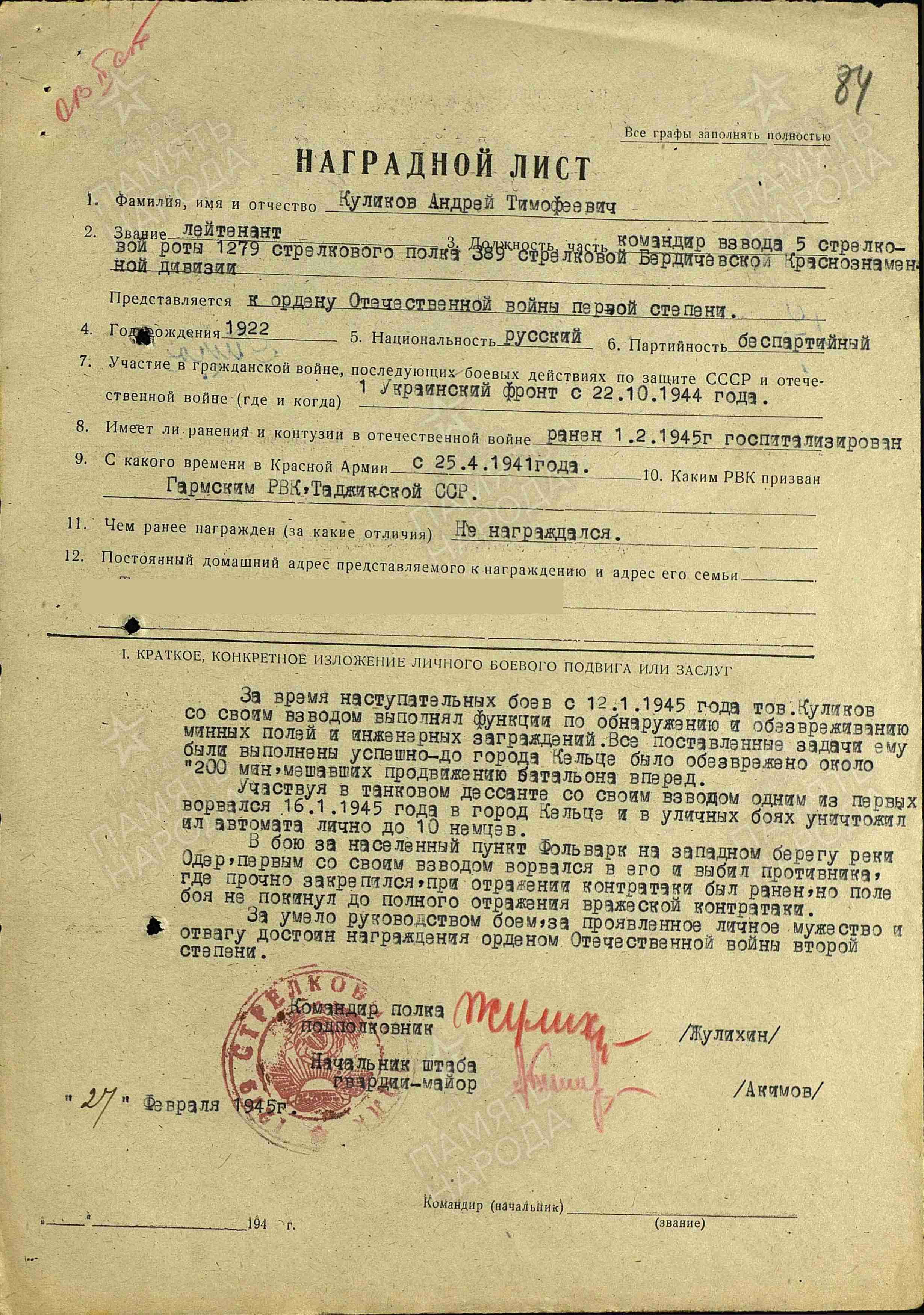 КУЛИКОВ Андрей Тимофеевич, 1922, с. Остолопово. Член ВЛКСМ. Мобилизован Гармским РВК ТаджССР 25 апр. 1941. Окончил Орловское военно-пехотное училище. В 1945 – лейтенант, ком. взвода 1279 СП 389 СД 76 СК 3 гв. А 1 УкрФ. Ранен 1 фев. 1945. Награждён орденом Отечественной войны 2 ст. Погиб 29 апр. 1945, д. Хальбе, округ Бранденбург, Германия.
