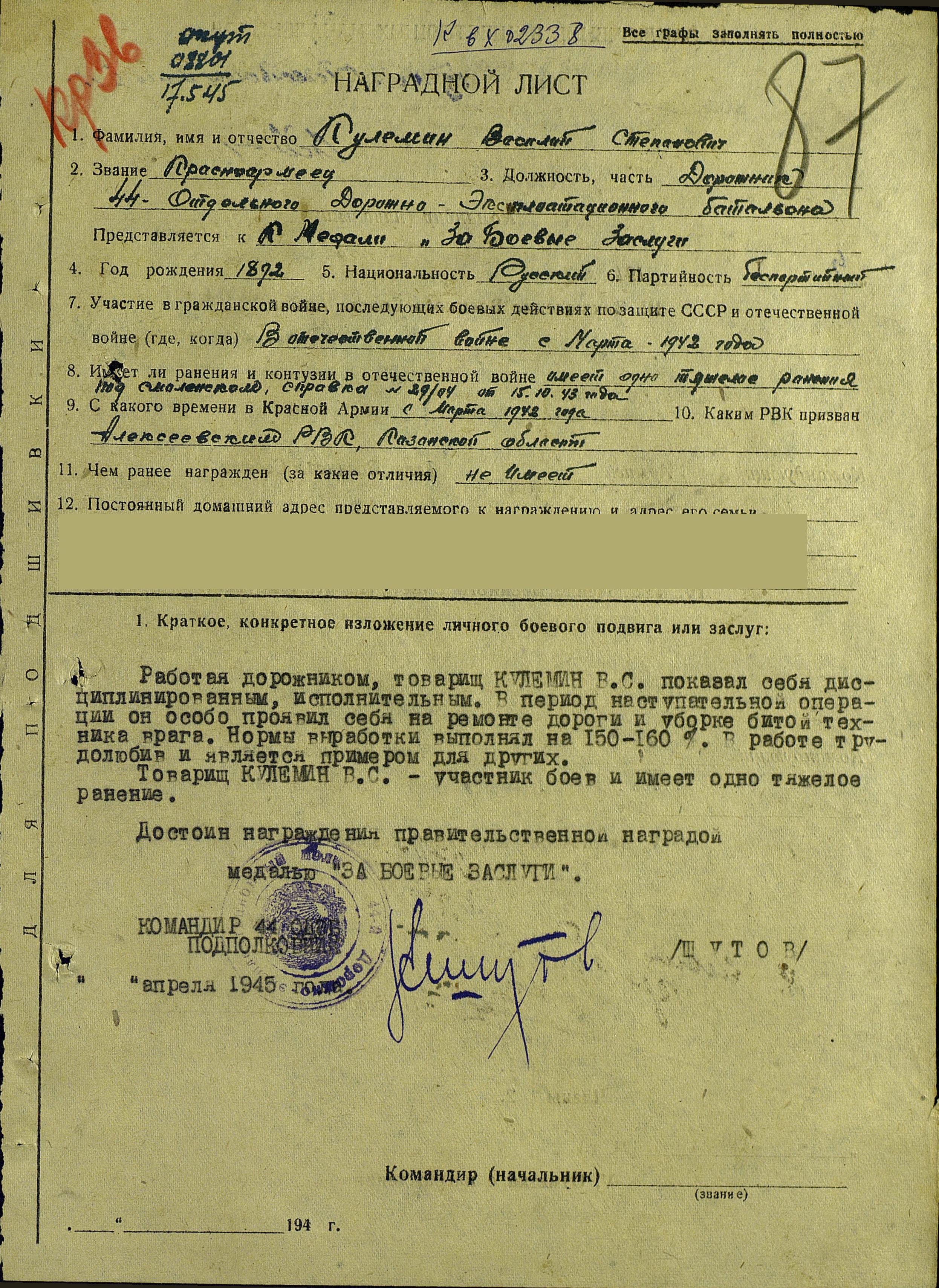 КУЛЁМИН Василий Степанович, 1892, д. Николаевка. Жил в с. Алексеевское. До призыва в армию работал в тылу, з-д "Сухое молоко". Мобилизован Алексеевским РВК 19 марта 1942. Красноармеец, стрелок пехоты. Тяжело ранен на Смоленском направлении Западного фронта. Проходил лечение в ЭГ 2296, Калининская обл. до марта 1943. Повторно мобилизован как нестроевой 19 июля 1943. 59 отд. рабочий батальон, в 1945 - дорожник 44 отд. дорожно-строительного батальона 2 Белорусского фронта. Участник освобождения Белоруссии и Польши. Награждён медалью "За боевые заслуги".