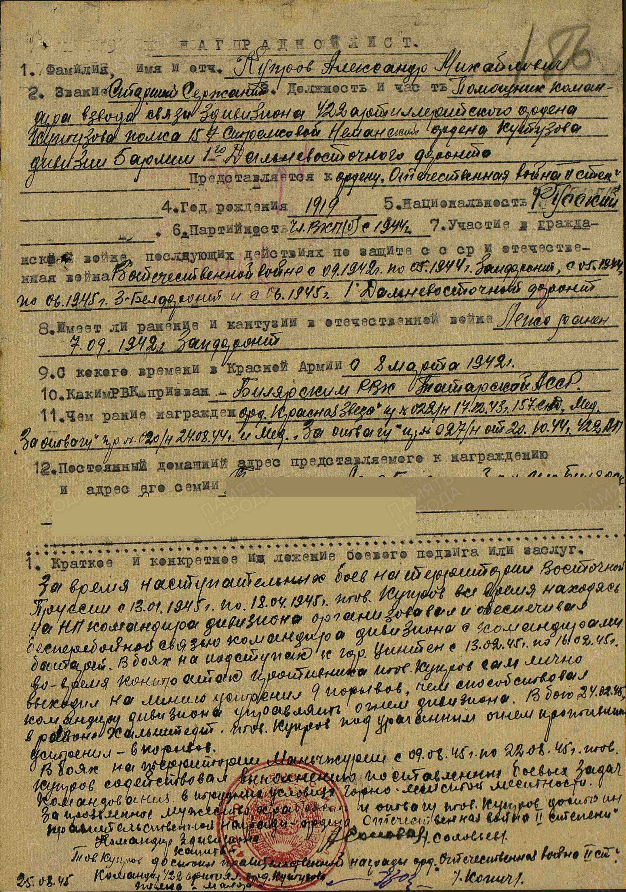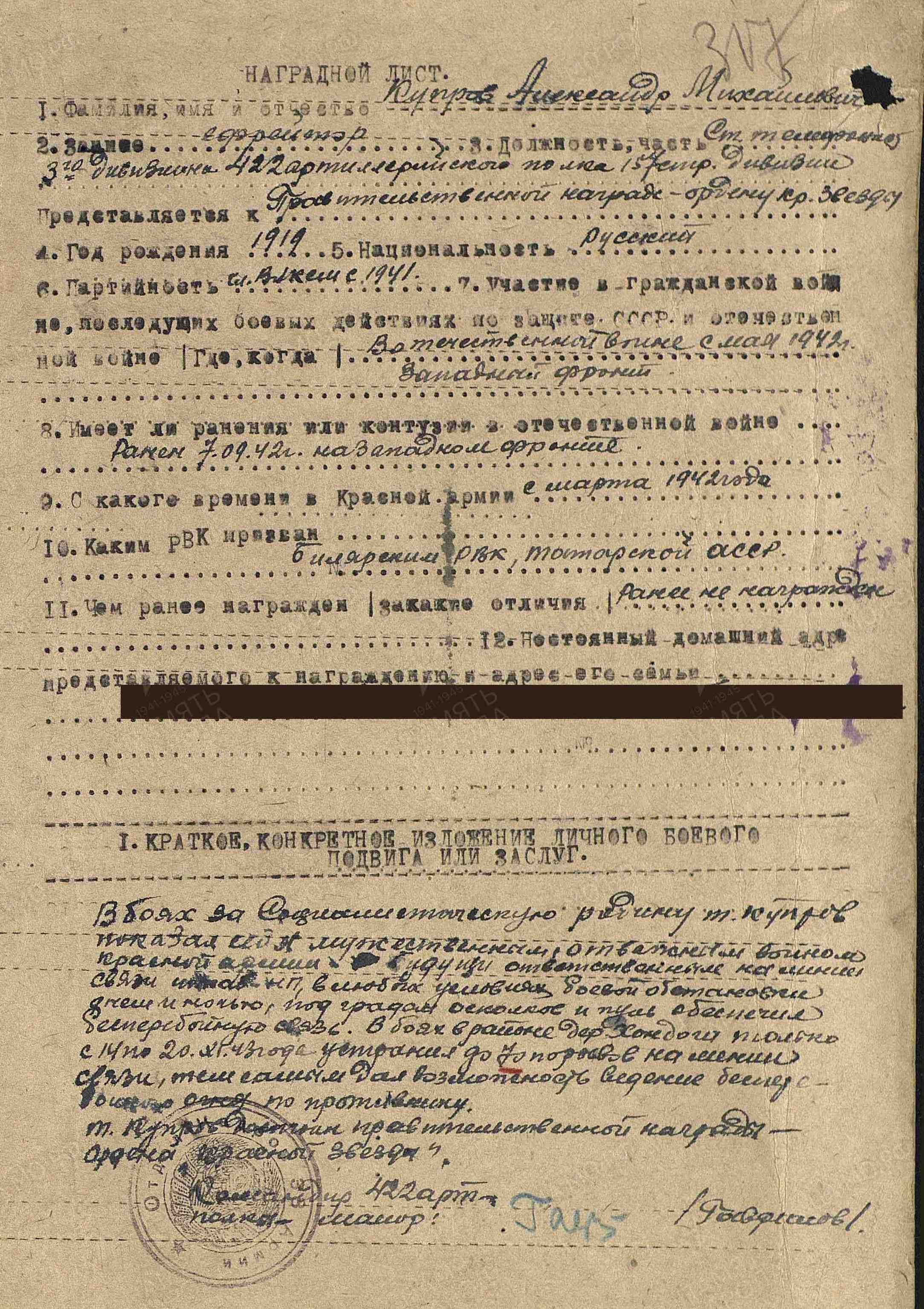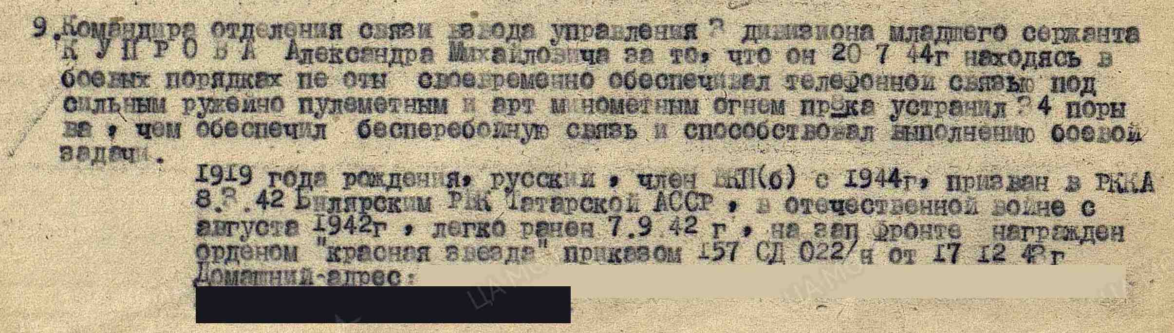 КУПРОВ Александр Михайлович, 1919, с. Билярск. Мобилизован Билярским РВК в сент. 1941, по другим данным – 8 марта 1942. Член ВЛКСМ/ ВКП(б). Воевал на Западном, 3 и 2 Белорусском, 1 Дальневосточном фронте в составе 68 А/ 33 А/ 21 А/ 5 А/ 11 гв. А. Ефрейтор/ мл. сержант/ ст. сержант, ст. телефонист/ пом. ком. взвода связи дивизиона 422 АП 157 СД. Участник освобождения Белоруссии, Советско-японской войны. Награждён двумя медалями «За отвагу», медалью «За победу над Японией», двумя орденами Красной Звезды.