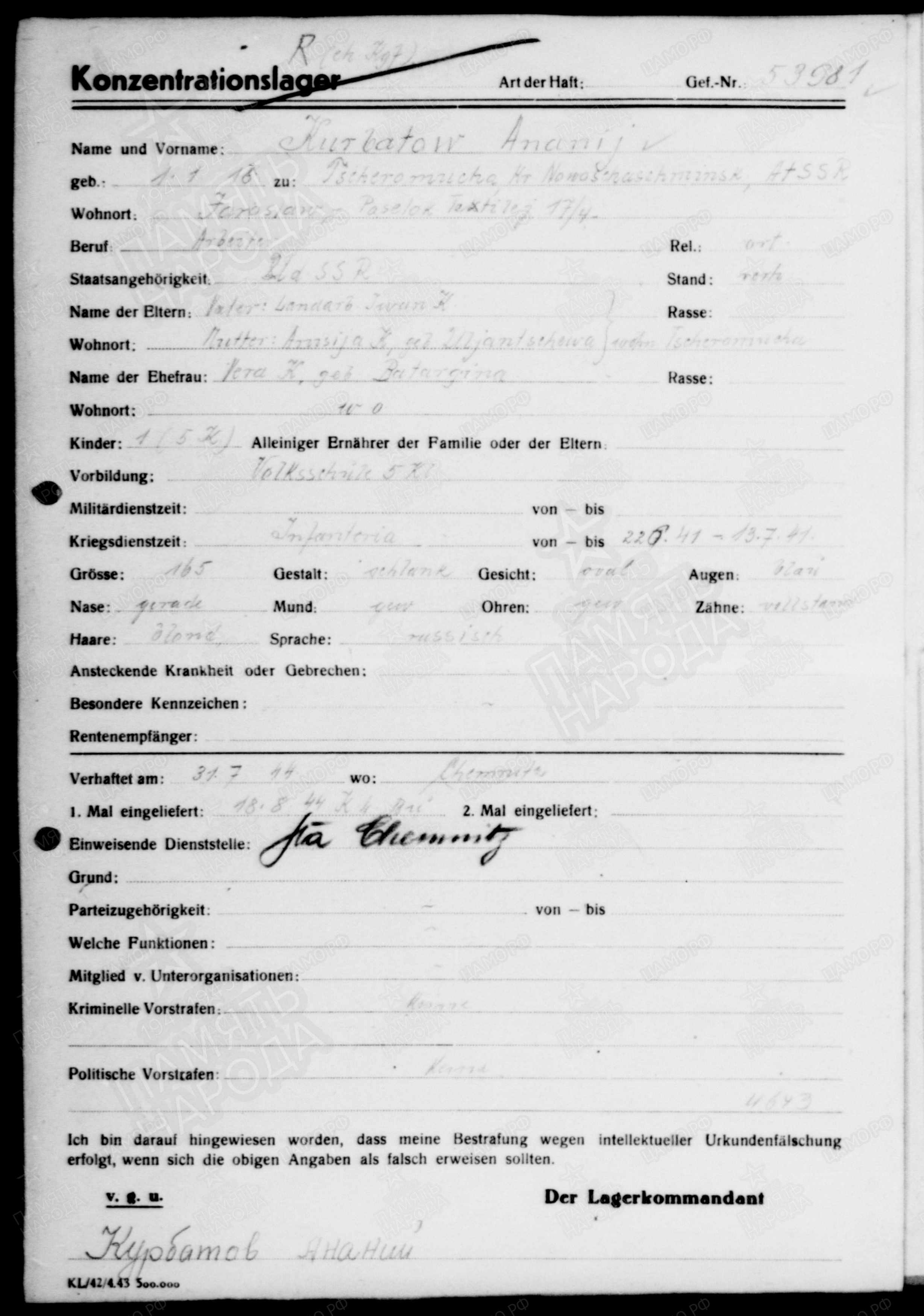 КУРБАТОВ АНАНИЙ ИВАНОВИЧ родился в 1918 году в с.Сл.Черемуховая Казанской губернии Чистопольского уезда Новошешминской волости. (ныне с.Слобода Черемуховая Новошешминского района РТ). Мобилизован Новошешминским РВК,кр-ц. Причина смерти: (попал в плен) убит 18.08.44.г. Область выбытия: Германия, г.Бухенвальд,Ваймар.