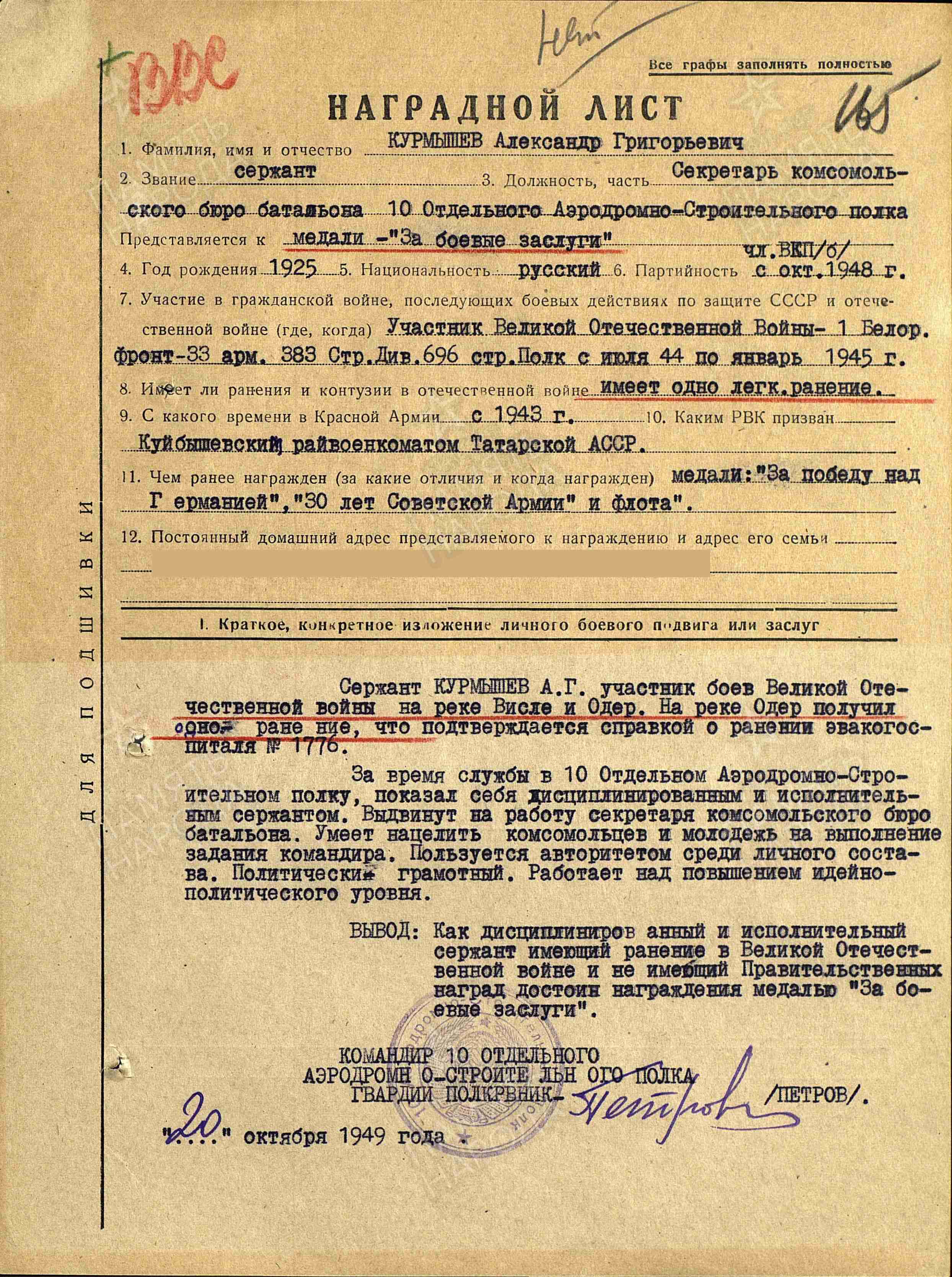 КУРМЫШЕВ Александр Григорьевич, 1926, с. Базяково. Мобилизован Куйбышевским РВК 9 нояб. 1943. На фронте с июля 1944. Красноармеец, 696 СП 383 СД 33 А 1 Белорусского фронта. Участник боёв на Висле и Одере. Легко ранен в янв. 1945. На излечении – в ЭГ 1776, г. Седлец, Польша. В 1949 – сержант, секретарь комсомольского бюро батальона 10 отд. аэродромно-строительного батальона, член ВКП(б) с 1948. Награждён двумя медалями «За боевые заслуги» (1951, 1953), медалью «За взятие Берлина», орденом Отечественной войны 1 ст. (1985).