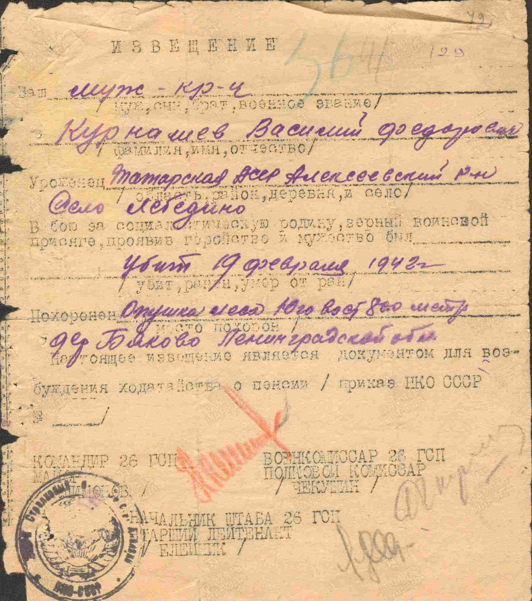 КУРНАШЕВ Василий Фёдорович, 1903(4), с. Лебедино. Мобилизован 26 авг. 1941 Алексеевским РВК. Гв. красноармеец, ездовой 26 гв. СП 7 гв. СД 1 гв. СК Северо-Западного фронта. Погиб 19 фев. 1942, д. Бяково, Полавский (Старо-Русский) р-н, Новгородская обл. Увековечен на братском захоронении в д. Коровитчино.