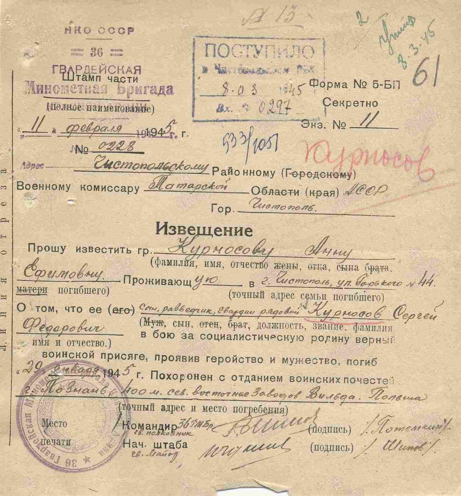 Сергей Федорович Курносов родился в 1921 г. в г.Чистополе, ТАССР. В 1940 г. призван в ряды Красной Армии Чистопольским военным комиссариатом. Службу проходил в 36 Гвардейской минометной бригады.