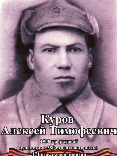 Куров Алексей Тимофеевич родился в 1908 году в с.Слобода Петропавловская Казанской губернии Чистопольского уезда Новошешминской волости. Призван Родниковским РВК, Ивановской обл., кр-ц, погиб 02.04.44 г. Место захоронения: Псковская обл. Пустошкинский р-н,с.Криухи(погиб в д.Маслово).