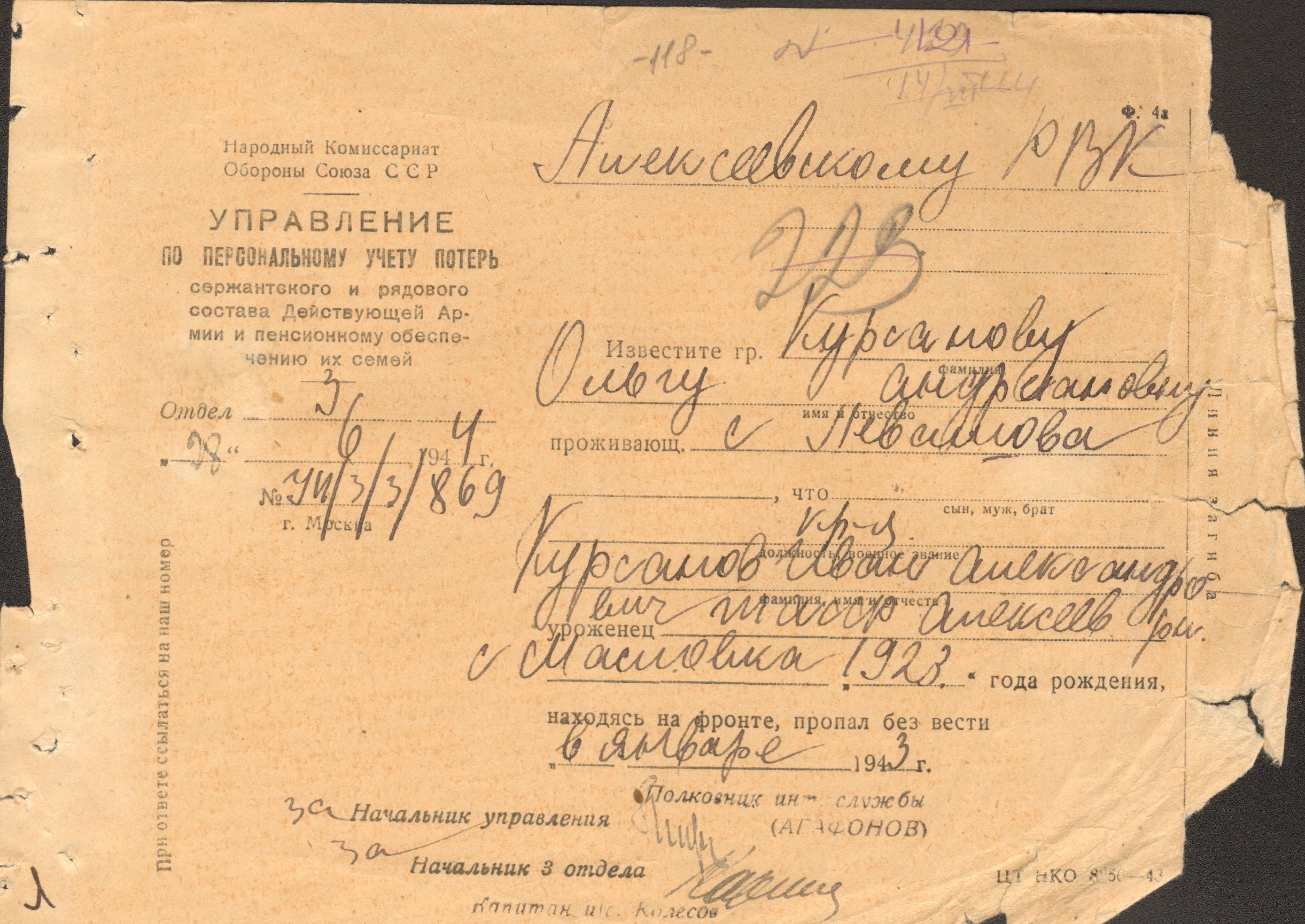 КУРСАНОВ Иван Александрович, 1923, с. Масловка. Мобилизован в РККА в 1942 Алексеевским РВК. Красноармеец, полевая почта 425, в/часть 307. Погиб 13 сентября 1942 г. в Сталинграде. По другим данным (ЦАМО) пропал без вести в январе 1943 г. Если исходить из номера полевой почты то это 295 стрелковая дивизия, находившаяся с сентября 1942 г. в составе 37 Армии Закавказского фронта.