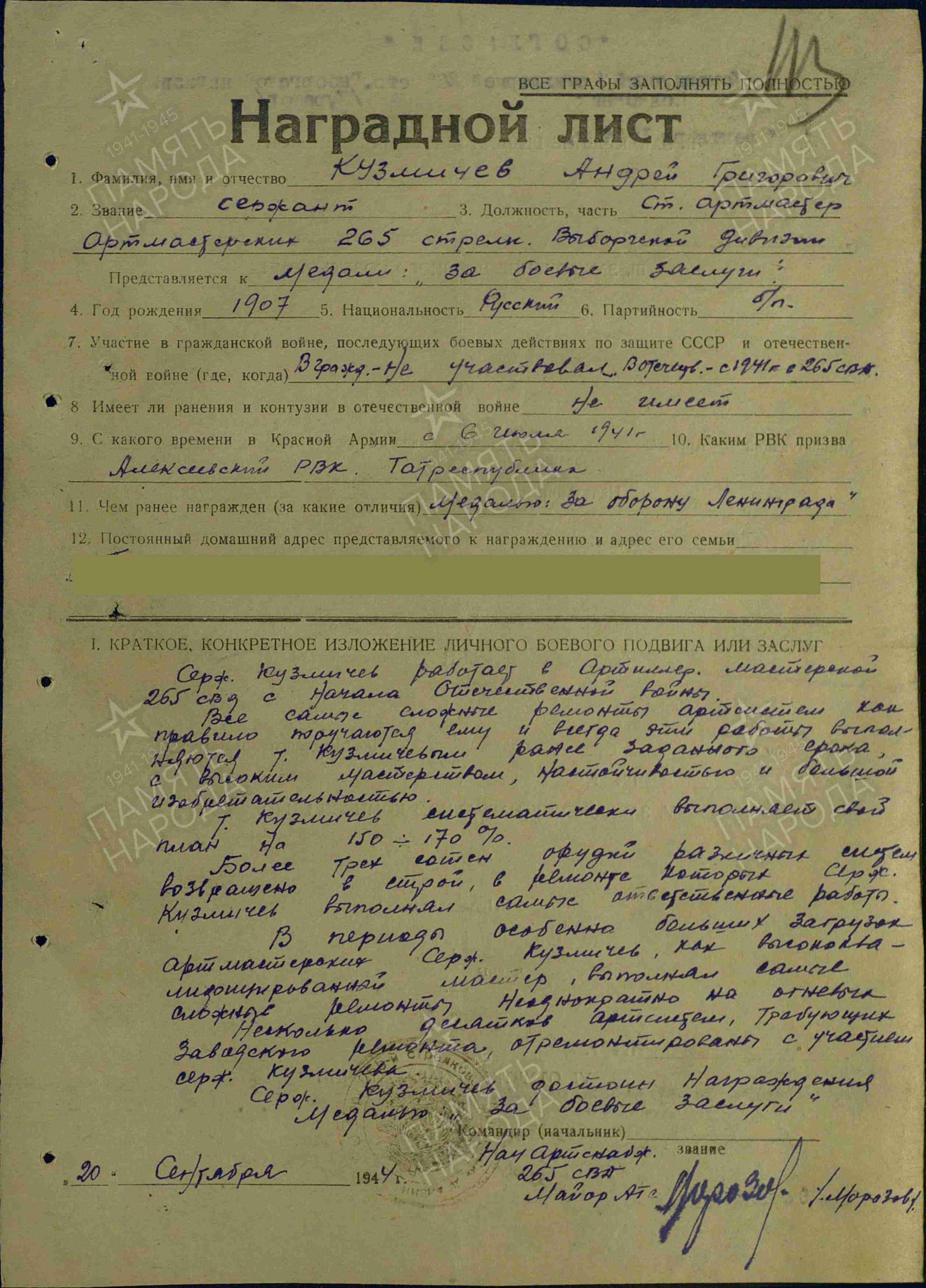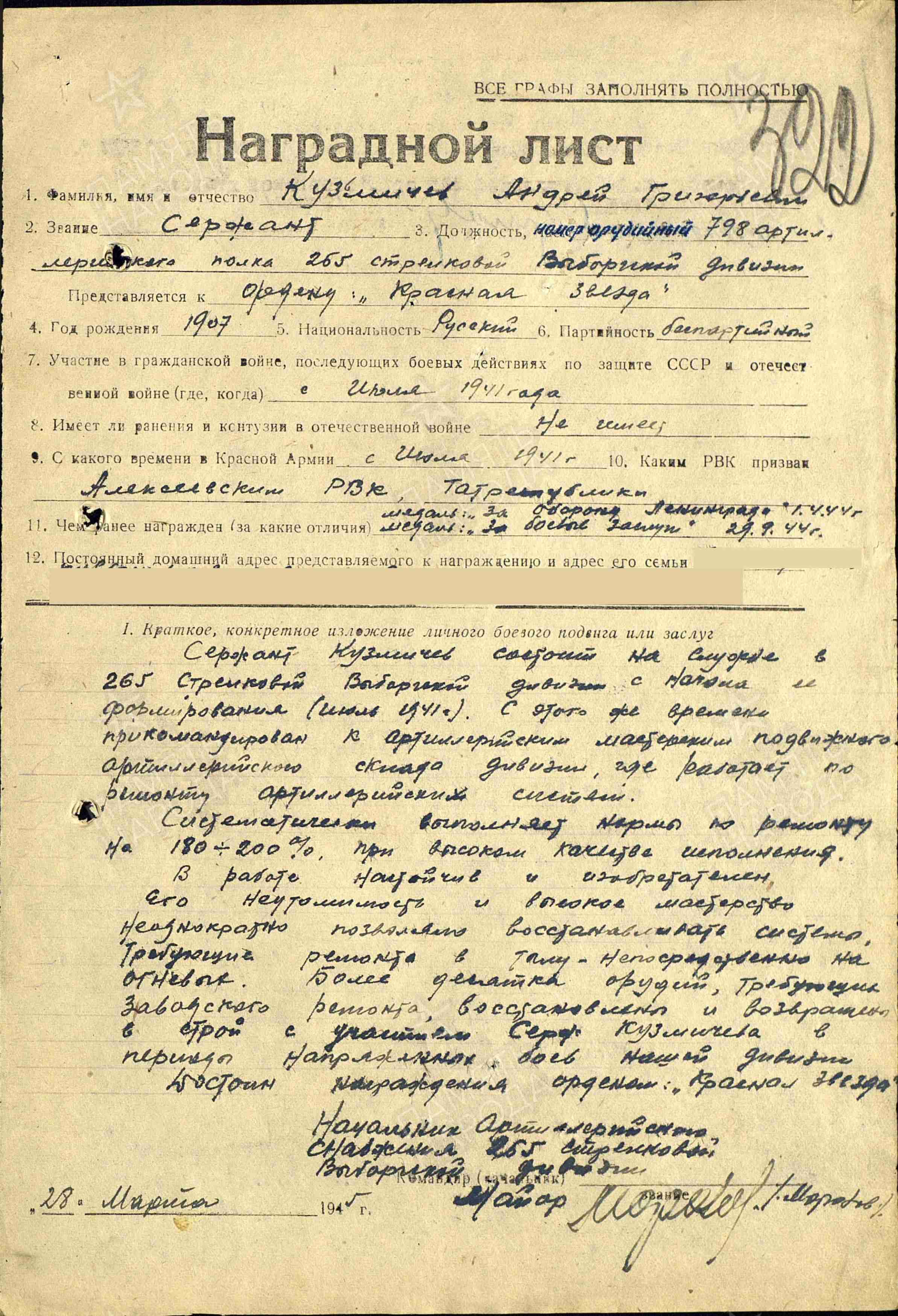 КУЗЬМИЧЁВ Андрей Григорьевич, 1907, д. Ямкино. Мобилизован 6 июля 1941. Сержант, орудийный номер 798 АП, ст. артиллерийский мастер арт. мастерских подвижного арт. склада 265 СД 23 А/ 54 А/ 8 А Ленинградского и Волховского фронта, 67 А 3 Прибалт. фронта, 3 УдА 2 Прибалт. и 1 Белорусского фронта. Награждён медалями «За боевые заслуги», «За оборону Ленинграда», «За взятие Берлина», орденами Красной Звезды, Отечественной войны 2 ст. (1985). Скончался в 1994.