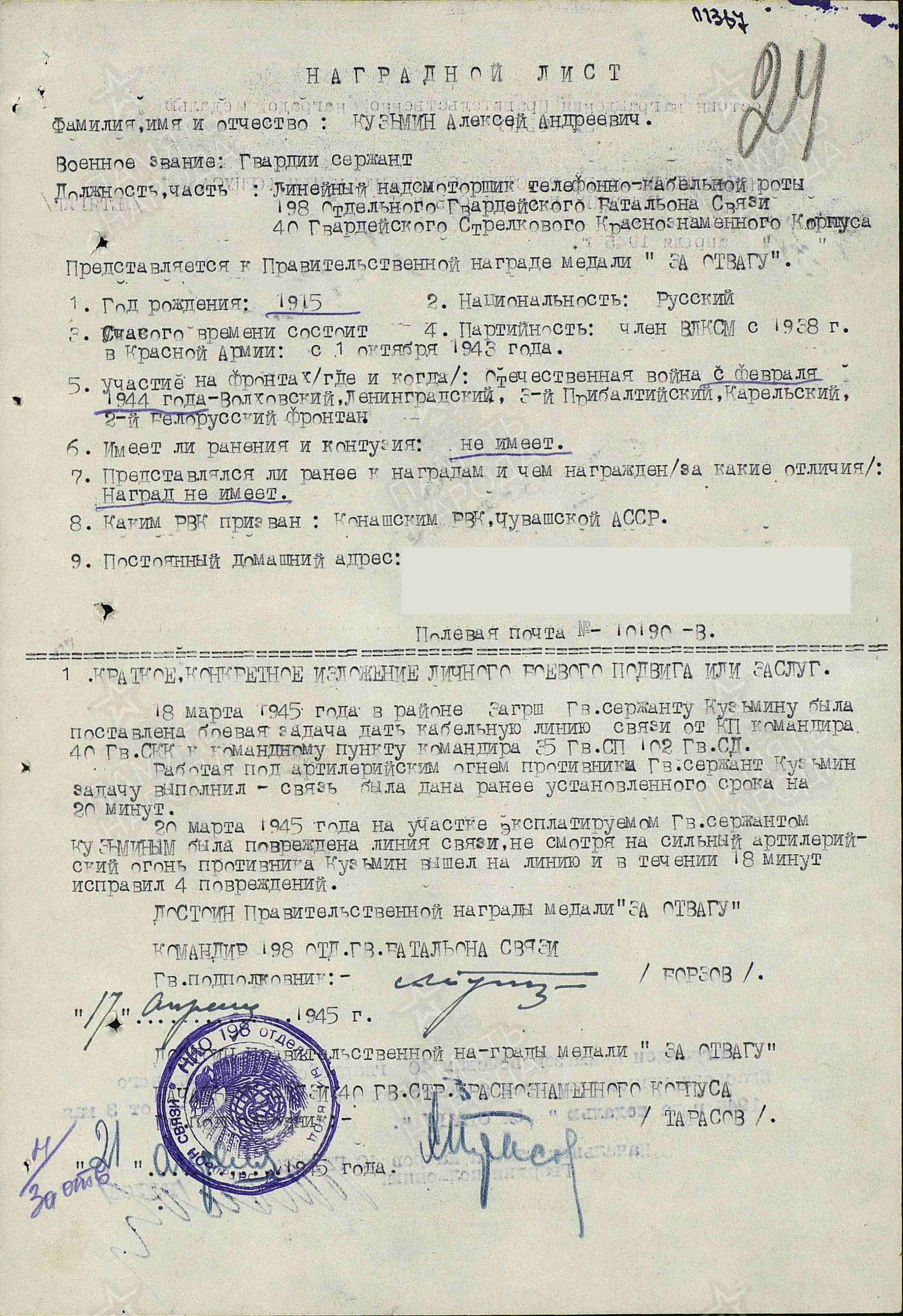КУЗЬМИН Алексей Андреевич, 1915, с. Лягушкино. Член ВЛКСМ с 1938. Мобилизован 1 окт. 1943 Канашским РВК ЧувАССР. В боях с фев. 1944. Сержант/ гв. сержант, линейный надсмотрщик 944/ 198 гв. отд. батальона связи 99/ 40 гв. СК в составе 8 А Волховского, 54 А Ленинградского, 3 Прибалтийского, 7 А/ 14 А Карельского, 19 А/ 2 УдА 2 Белорусского фронта. Награждён медалью «За отвагу».