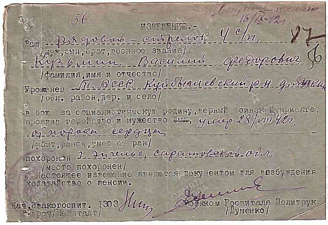 КОРНИШИН Василий Фёдорович, 1899, д. Ямкино. Мобилизован Куйбышевским РВК ТатАССР 3 авг. 1941. Красноармеец, стрелок. 24 авг. 1942 поступил в ЭГ 1303, г. Энгельс, Саратовская обл. Умер 28 авг. 1942 от порока сердца. Погребён на городском кл-ще.