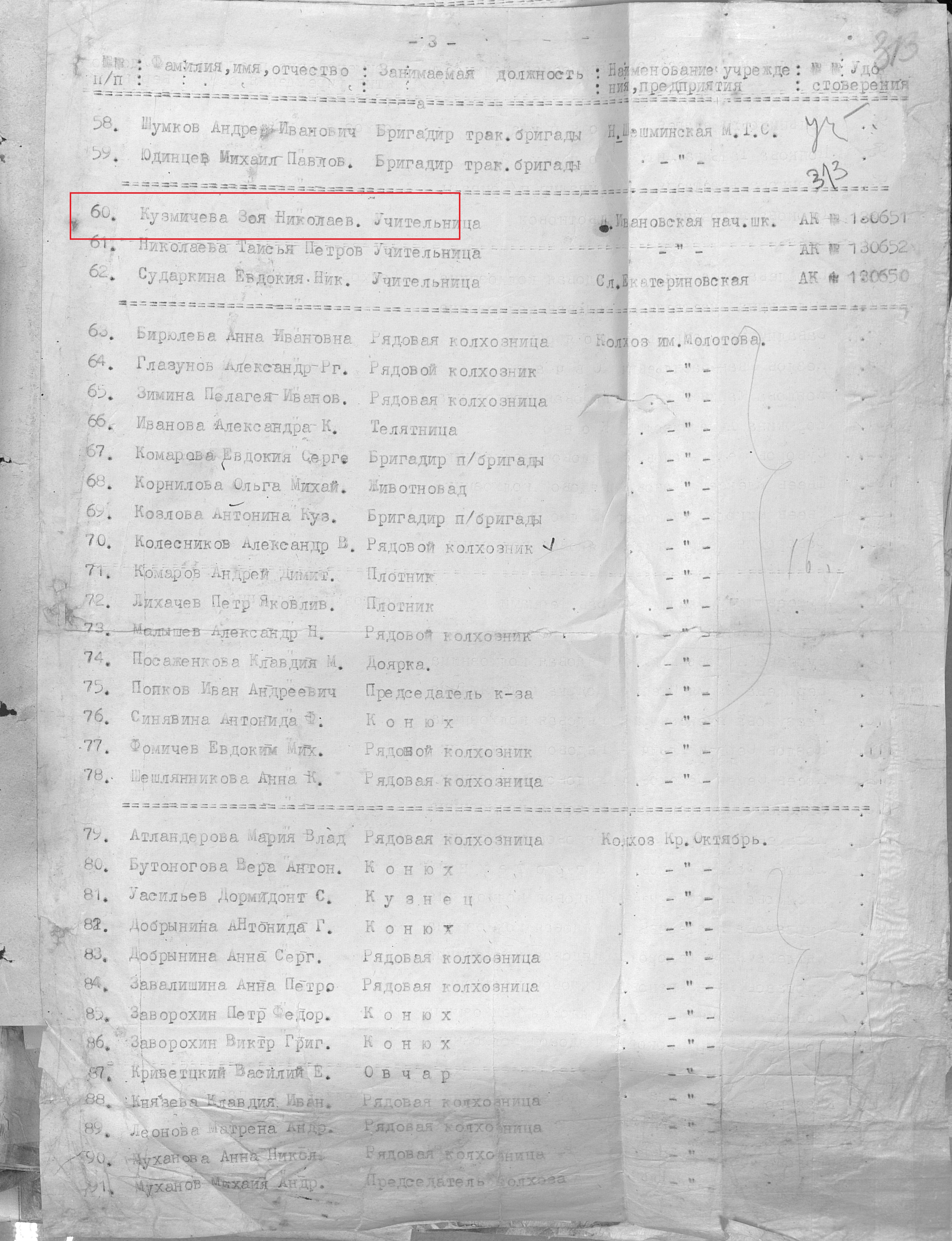 Кузьмина Зоя Николаевна родилась в 1924 году. Место жительства: д.Дальняя Ивановка Ново-Шешминский район ТАССР (ныне Альметьевский район РТ). В годы Великой Отечественной войны работала в Д.Ивановской начальной школе учительницей. Награждена медалью "За доблестный труд в Великой Отечественной войне 1941–1945 гг." (Акт от 28 апреля 1947 г, фонд 3610, опись 2, дело № 325, лист 313, АК № 130651).