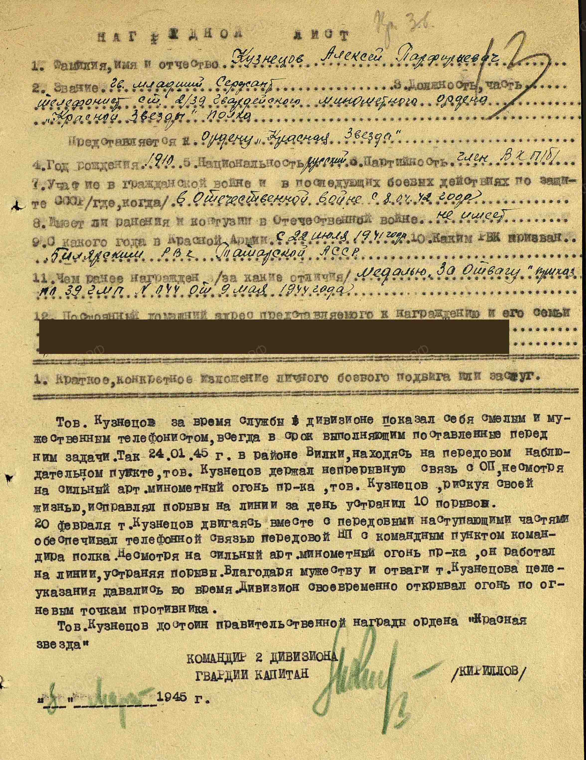 КУЗНЕЦОВ Алексей Порфирьевич, 1910, д. Александровка. Мобилизован Билярским РВК 22 июля 1941. Член ВКП(б). Воевал с 8 апр. 1942 на Северо-Западном, Калининском, 1 и 2 Прибалтийском, Ленинградском, Забайкальском фронте в составе 11 А/ 34 А/ 43 А/ 4 УдА/ 6 гв. А/ 11 гв. А/ 51 А/ 67 А/ 17 А. Гв. мл. сержант, ст. телефонист дивизиона (251 гв.) 39 гв. МинП реактивных миномётов. Участник освобождения Прибалтики, Советско-японской войны. Награждён медалями «За отвагу», «За победу над Японией», орденом Красной Звезды.