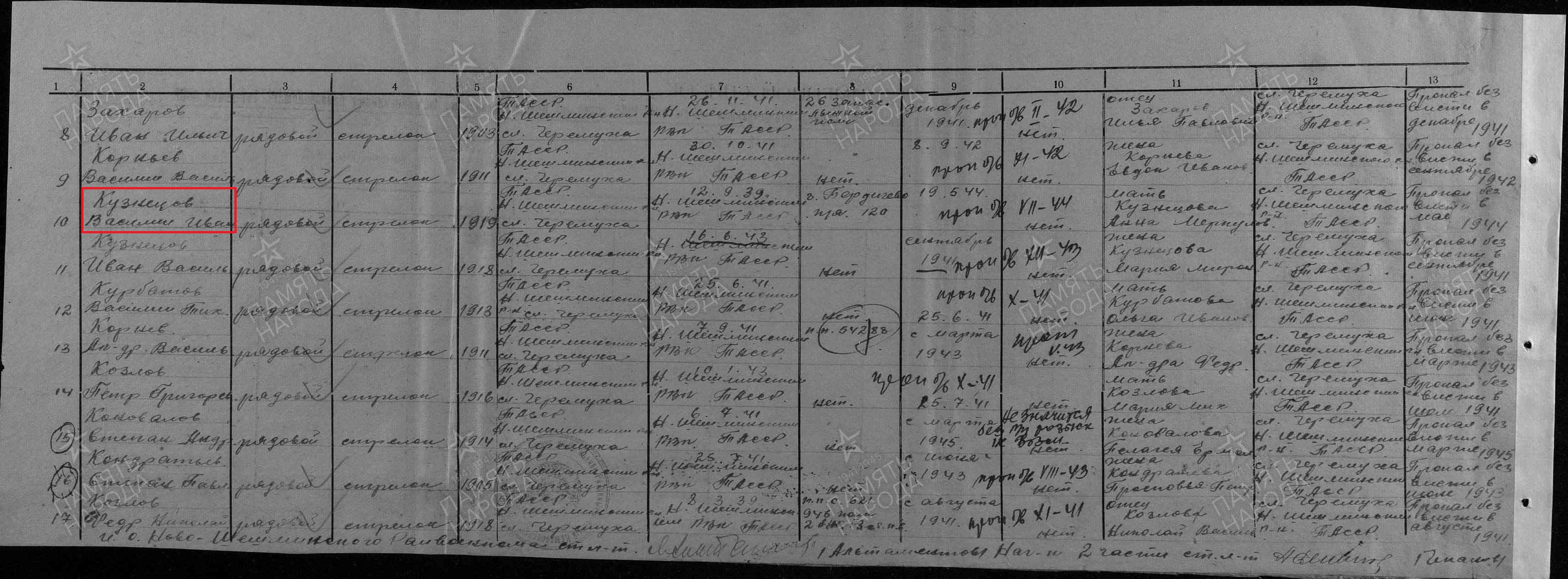 КУЗНЕЦОВ ВАСИЛИЙ ИВАНОВИЧ родился в 1919 году в с.Сл.Черемуховая Казанской губернии Чистопольского уезда Новошешминской волости (ныне с.Слобода Черемуховая Новошешминского района РТ). Мобилизован Новошешминским РВК,кр-ц, п/я 120. Пропал без вести 07.44.г.