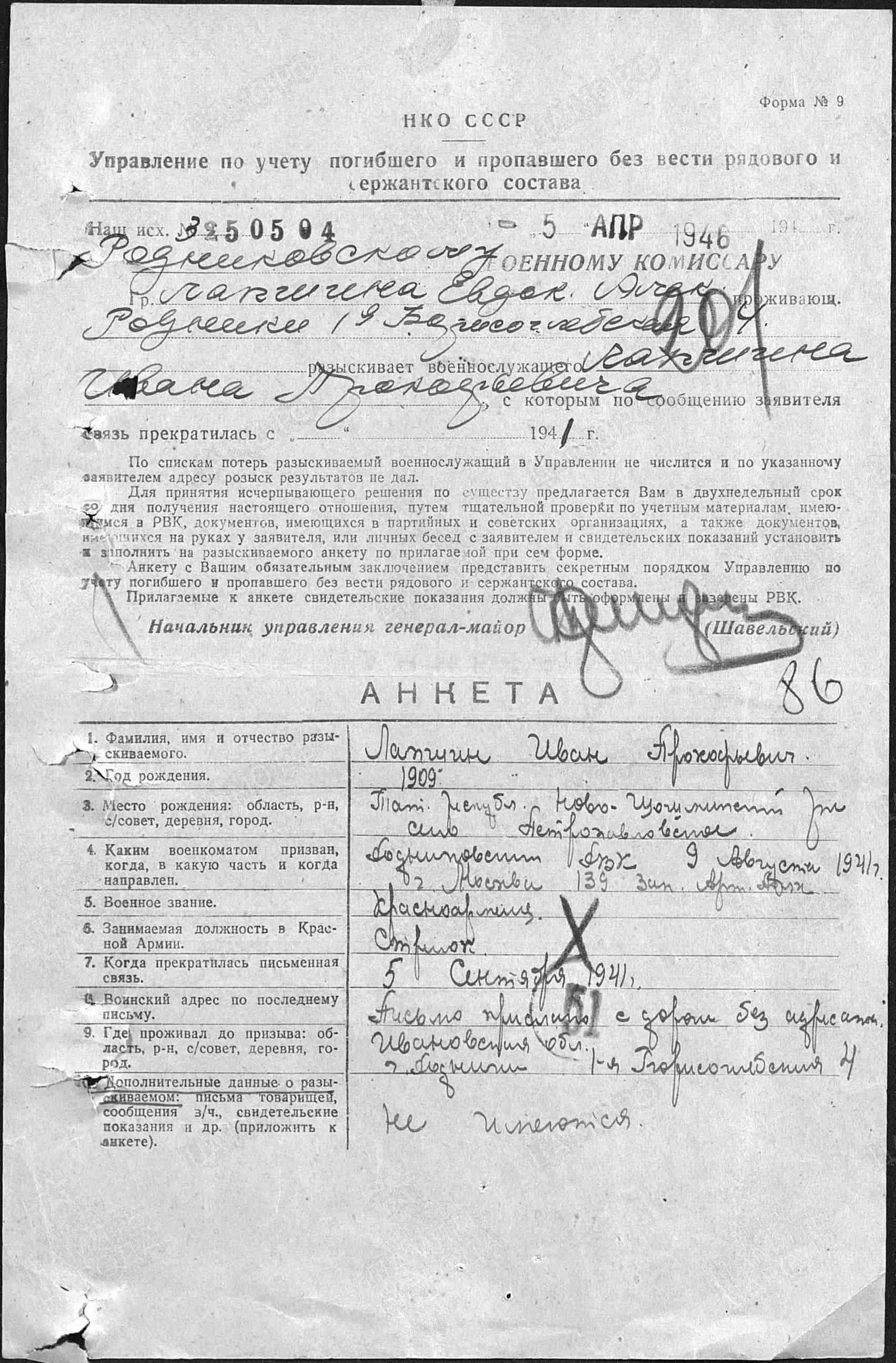 Лапшин Иван Прокофьевич родился в 1909 году в с.Слобода Петропавловская Казанской губернии Чистопольского уезда Новошешминской волости. Призван Родниковским РВК, Ивановской обл.,кр-ц, 139 зап. Пропал без вести 10.41 г. Место выбытия: Московская обл.