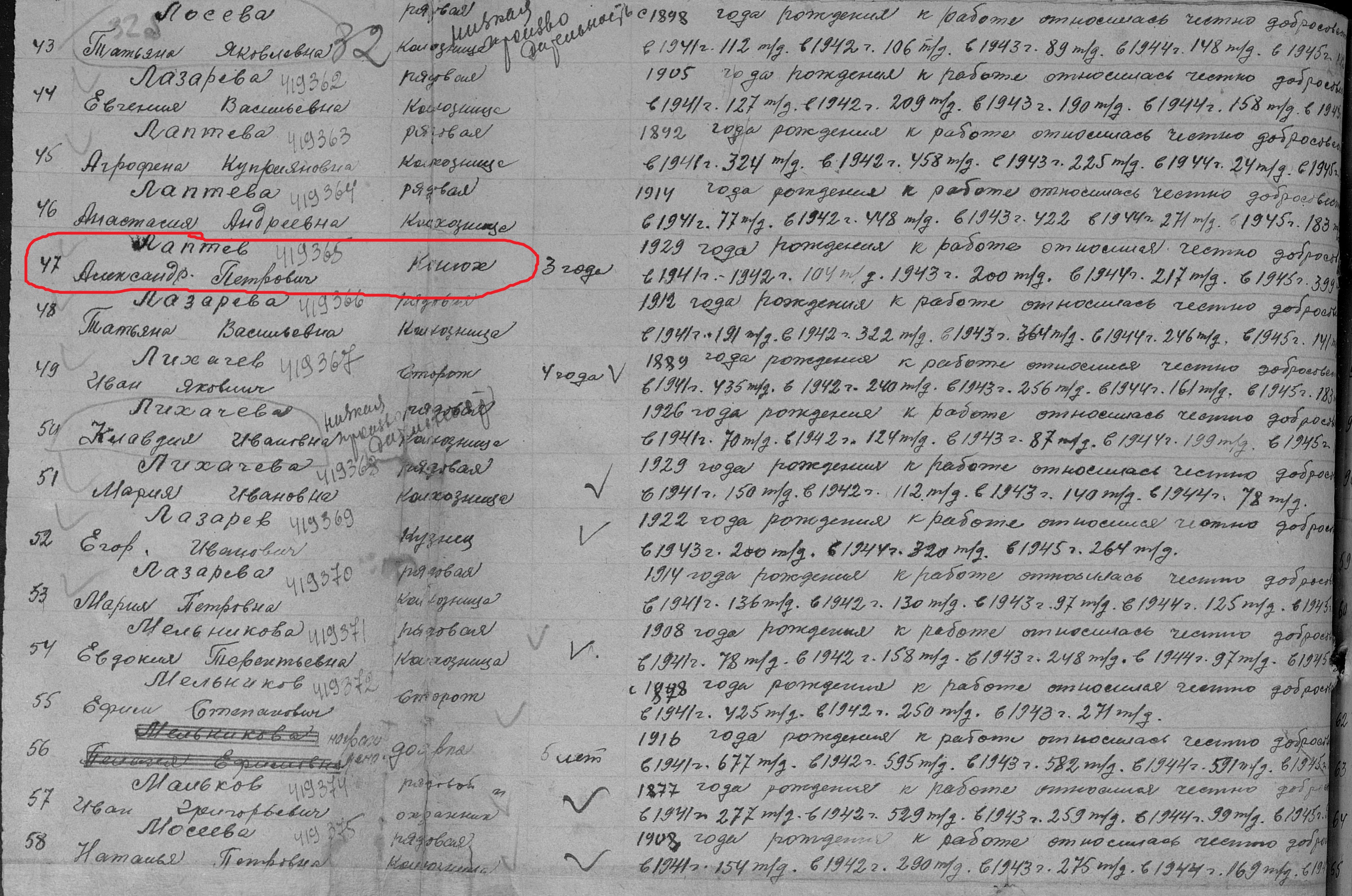 Лаптев Александр Петрович родился в 1930 году в с.Новошешминск Чистопольского кантона ТАССР. В годы Великой Отечественной войны работал в колхозе «Красный Октябрь» конюхом. Награжден медалью "За доблестный труд в Великой Отечественной войне 1941–1945 гг." (Акт от 28 апреля 1947 г, фонд 3610, опись 2, дело № 325, лист 32.№ 419365). Умер в 80-х годах, похоронен на сельском кладбище с.Новошешминск.