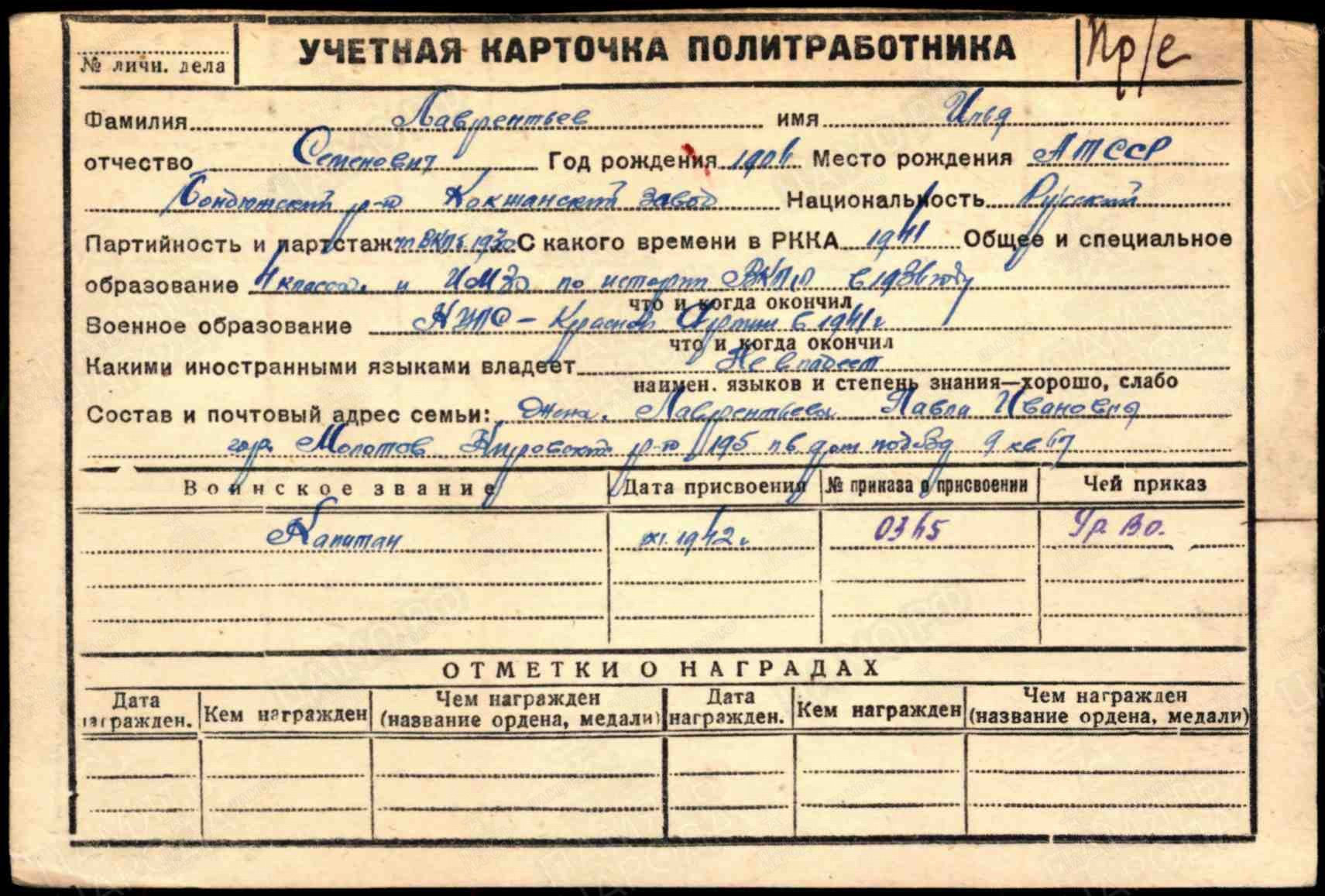 Мобилизован в 1941 г. Кировским РВК, Молотовская обл., г. Молотов, Кировский р-н.