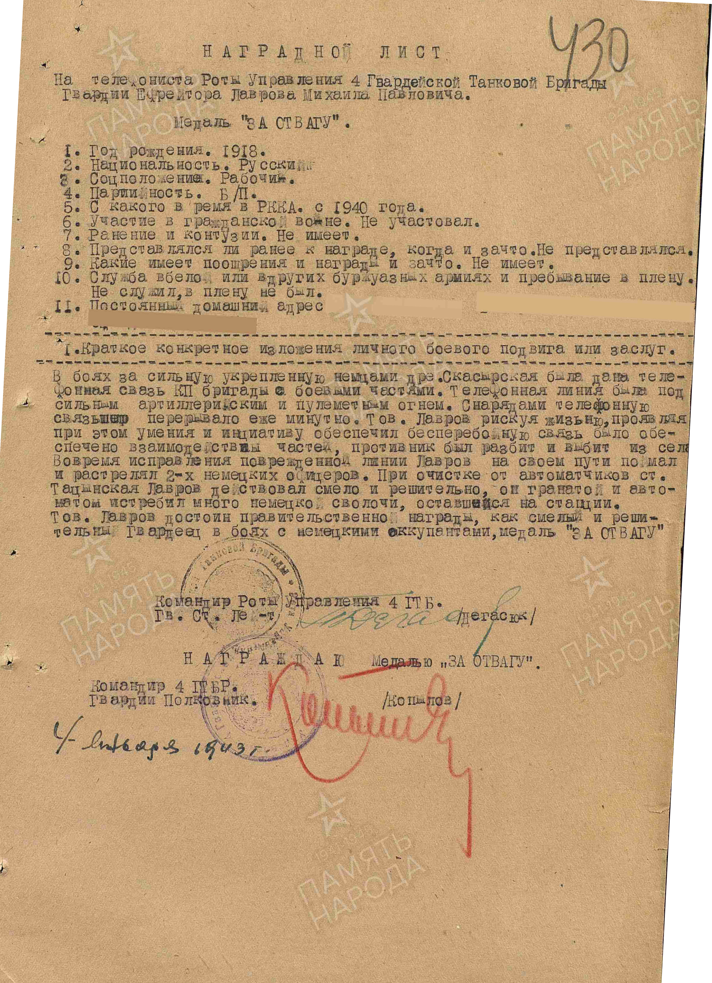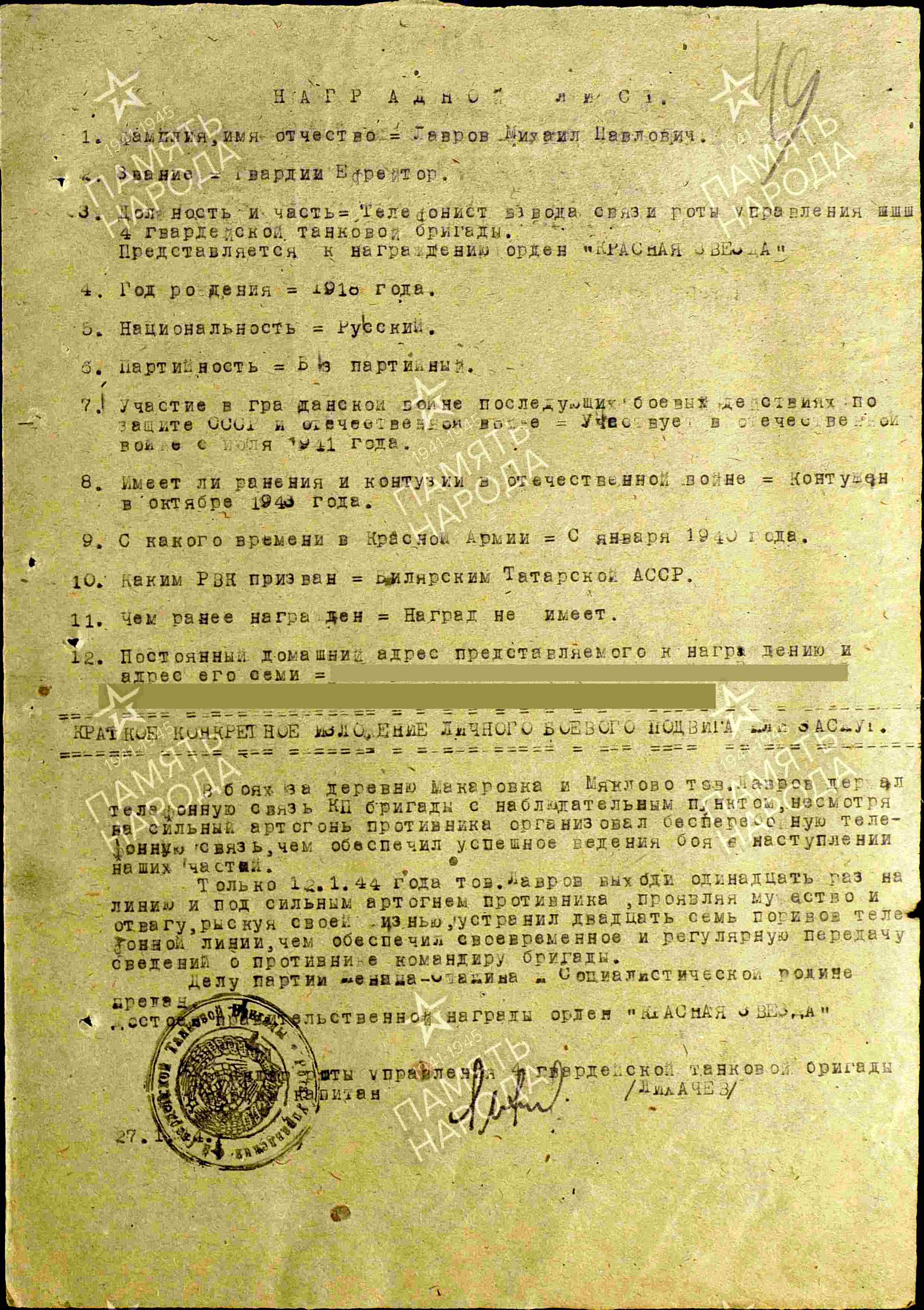 ЛАВРОВ Михаил Павлович, 1918, д. Бутлеровка (имение). Призван в янв. 1940 Билярским РВК. Участник войны с июля 1941. Красноармеец/ гв. ефрейтор/ гв. мл. сержант, телефонист взвода связи роты управления в составе 11 ТД 2 МехК 9 А/ 12 А Южного фронта, 132 ТБр 38 А/ 9 А ЮжФ, 4 гв. ТБр 57 А/ 56 А ЮжФ, 24 ТК ЮжФ/ Брянского фронта, 6 А Воронежского фронта, 2 гв. ТК/ 3 гв. А Юго-Западного/ Воронеж. фронта/ 21 А/31 А/ 10 гв. А/ 33 А Западного фронта, 11 гв. А 3 Белорусского фронта. Контужен в окт. 1943. Награждён Медалями «За оборону Сталинграда», «За отвагу», орденом Красной Звезды.