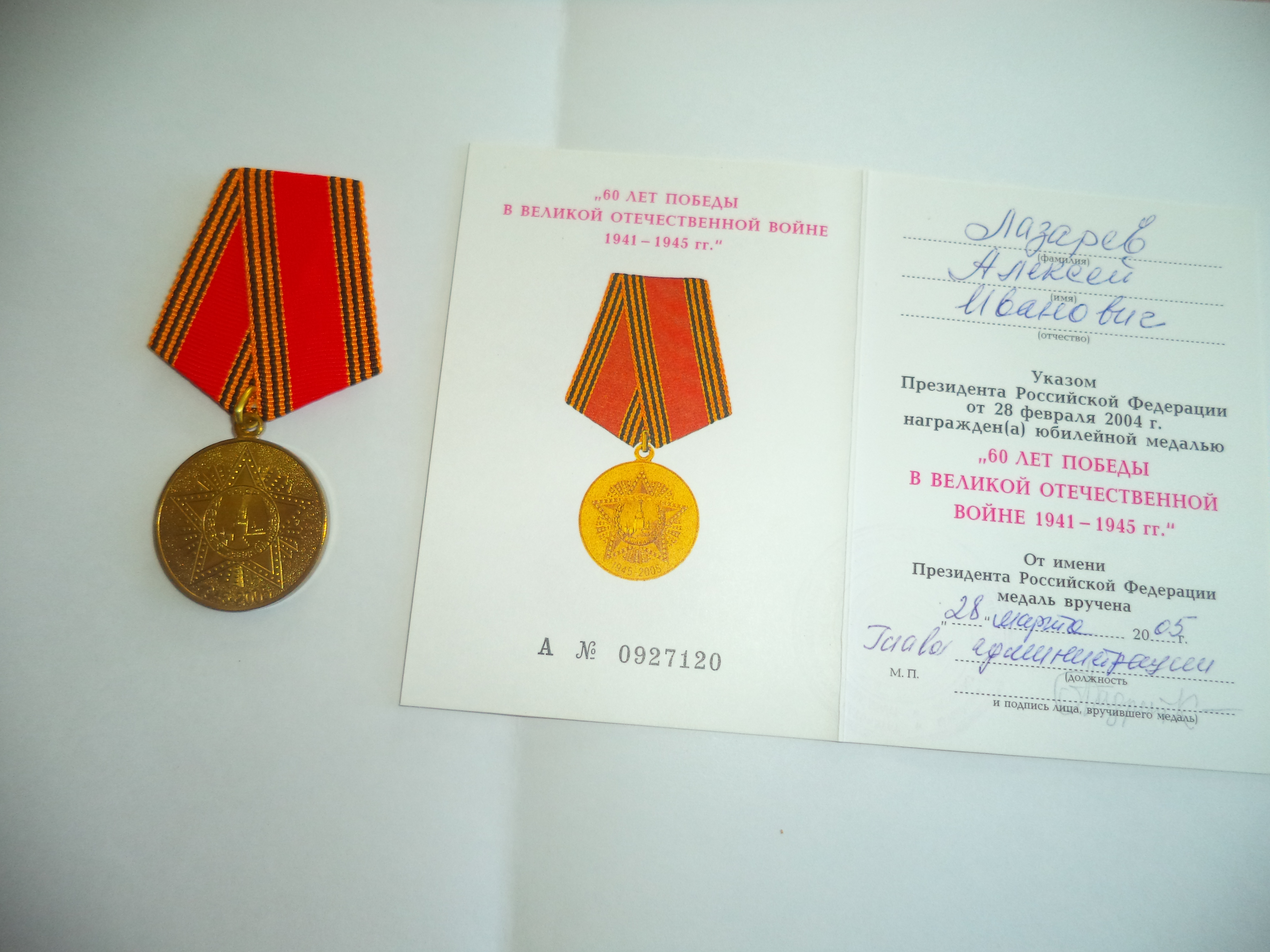 Лазарев А.И. награжден медалями «День Победы», «50 лет Победы», «55 лет Победы», «60 лет Победы», «65 лет Победы», памятный знак «Фронтовик 1941-1945гг.».