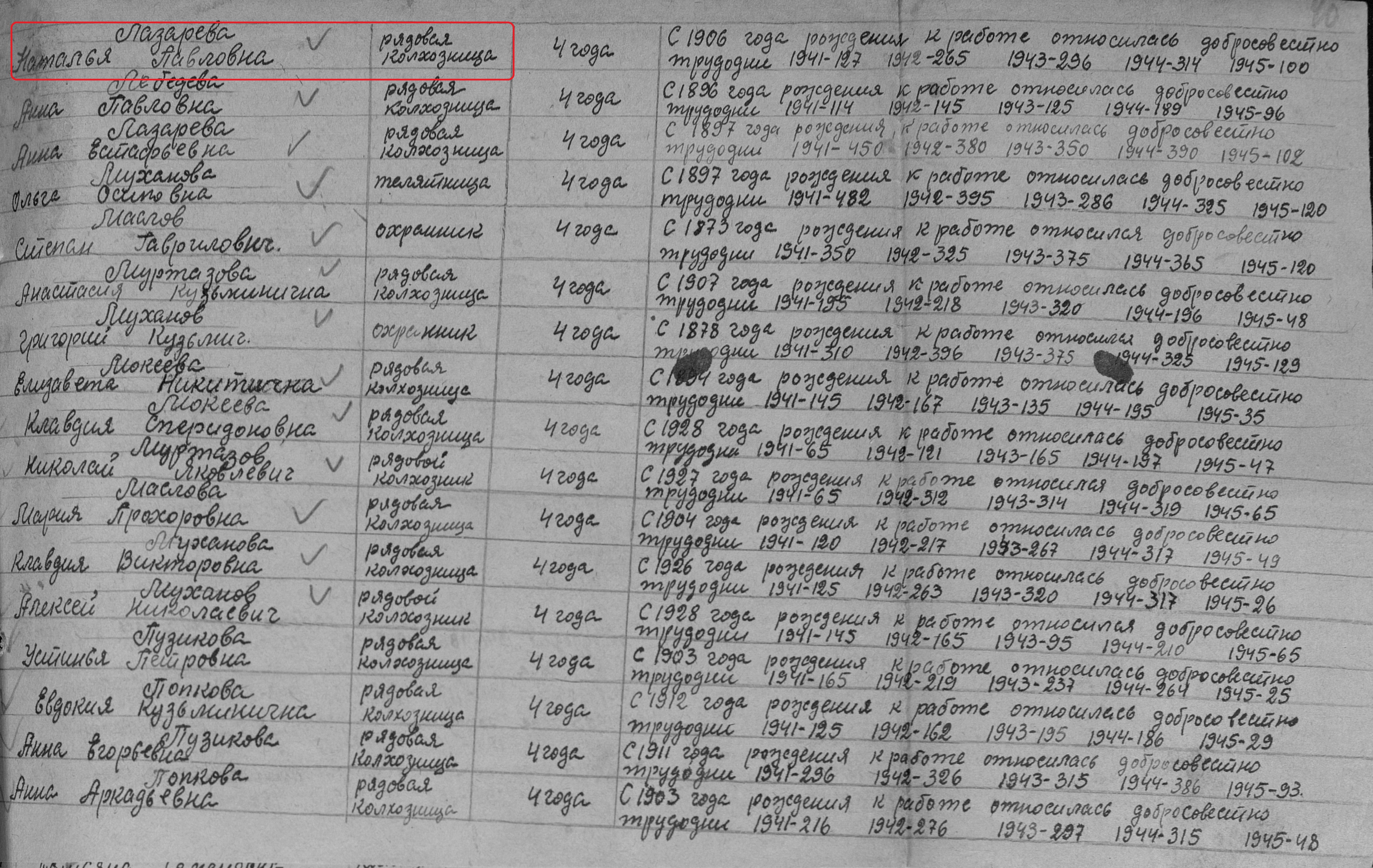 Лазарева Наталья Павловна родилась в 1908 году. Место жительства: с.Новошешминск Ново-Шешминский район ТАССР. В годы Великой Отечественной войны работала в колхозе им. Чкалова рядовой колхозницей. Награждена медалью "За доблестный труд в Великой Отечественной войне 1941–1945 гг." (Акт от 01.1946 г., фонд 3610, опись 2, дело № 325, лист 40).