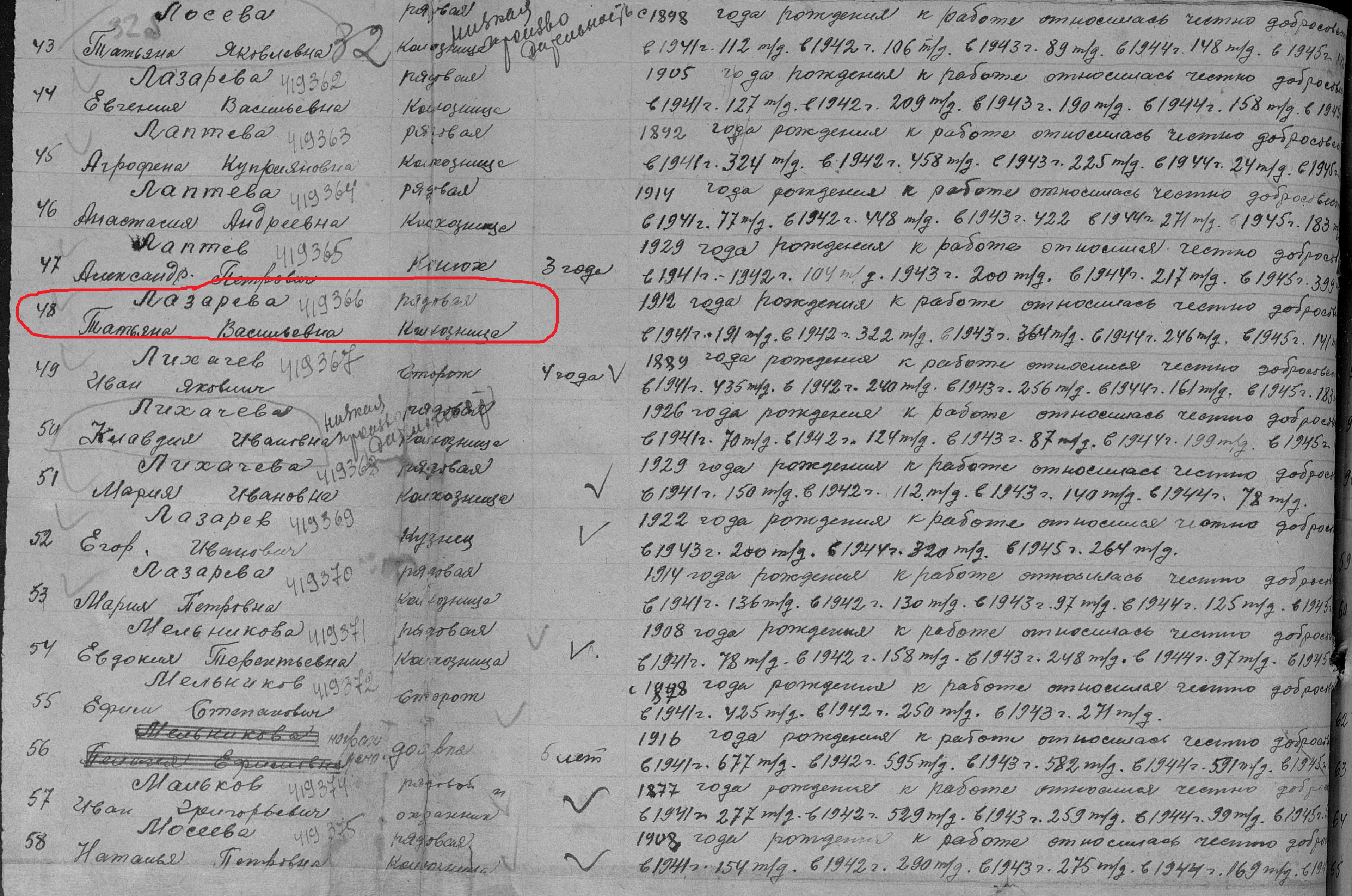 Лазарева Татьяна Васильевна родилась в 1912 году в с.Новошешминск Казанской губернии Чистопольского уезда Новошешминской волости. В годы Великой Отечественной войны работала в колхозе «Красный Октябрь» рядовой колхозницей. Награждена медалью "За доблестный труд в Великой Отечественной войне 1941–1945 гг." (Акт от 28 апреля 1947 г, фонд 3610, опись 2, дело № 325, лист 32.№ 419366). Похоронена на сельском кладбище с.Новошешминск.