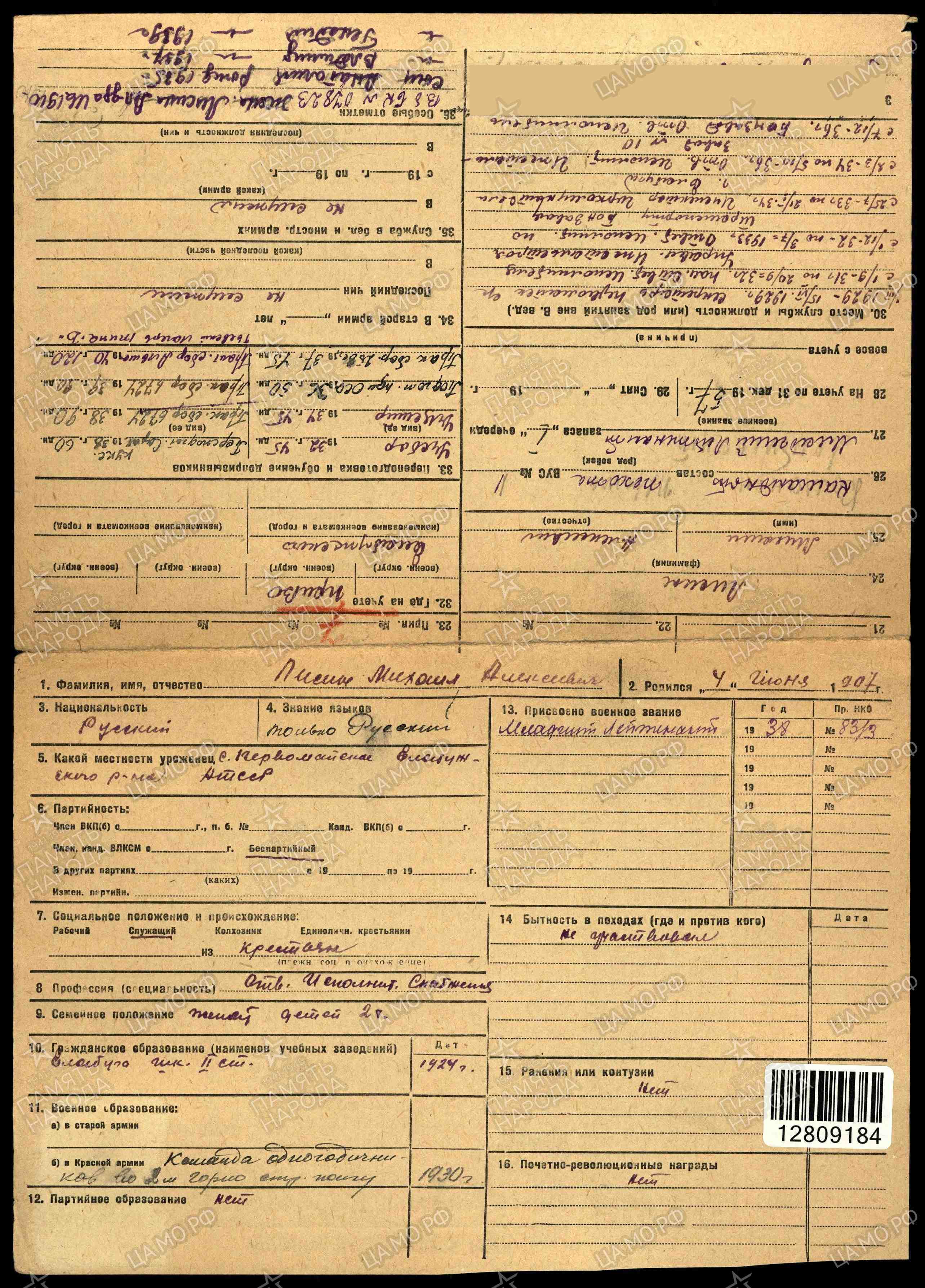 Родился 04.06.1907 г., Татарская АССР, Елабужский р-н, с. Первомайское. Социальное происхождение – из крестьян. В 1924 году окончил Елабужскую школу второй ступени. В 1929 году начал работу секретарем Первомайского сельсовета. Мобилизован в армию октябре 1929 года. Служил во 2-м горнострелковом полку, крепость Кушка.
