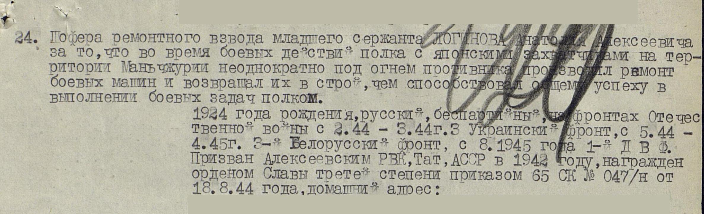 ЛОГИНОВ Анатолий Алексеевич, 1924, с. Ромодан. Мобилизован Алексеевским РВК в авг. 1942. Мл. сержант, заряжающий 953 ЛСАП. Воевал с авг. 1943 на ЗапФ, 3 УкрФ, 3 БелФ. Легко ранен в боях за г. Вильнюс 13 июля 1944. В пешем бою гранатами и автоматом уничтожил четырёх немецких солдат и двух взял в плен. В составе расчёта САУ уничтожил до 40 гитлеровцев, два орудия, шесть пулемётов, три ДЗОТ. Совместно с пехотинцами 97 СД взяли в плен до 90 немецких солдат. Награждён медалью «За отвагу» дважды, орденом Славы 3 ст. В августе 1945 принял участие в Советско-японской войне в качестве шофёра рем. взвода 478 гв. ТСАП 1 ДВФ.