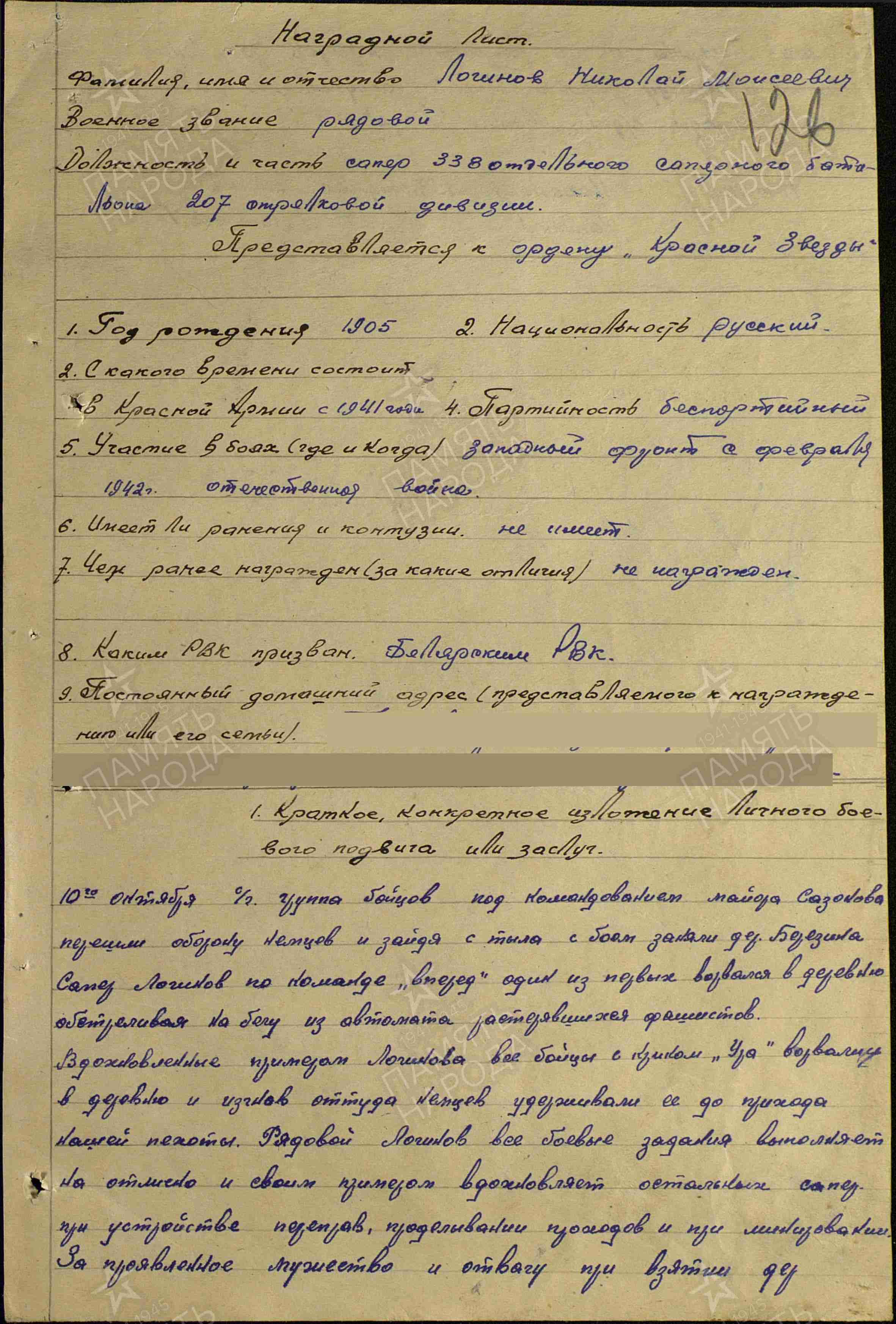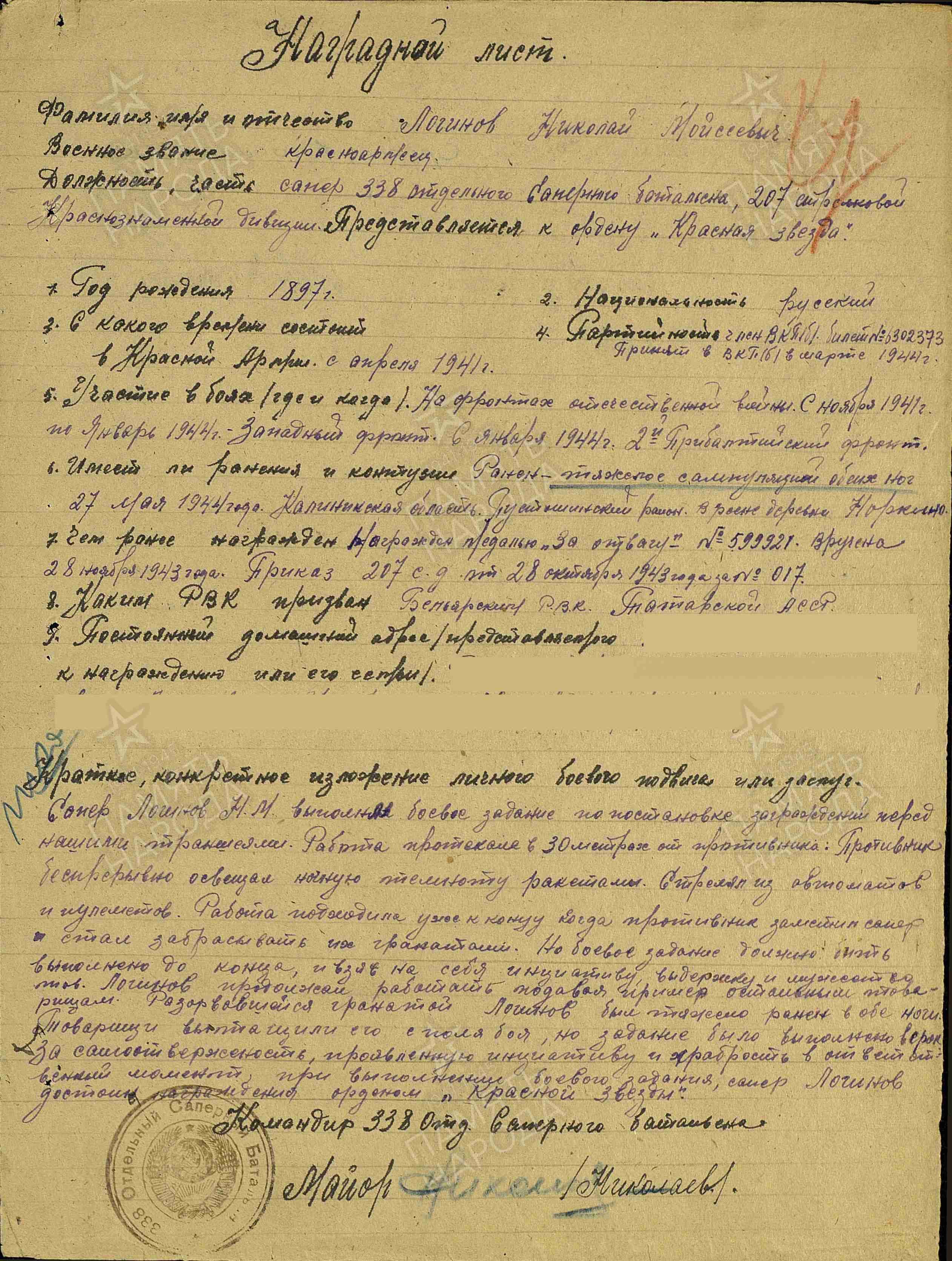 ЛОГИНОВ Николай Моисеевич, 1905, д. Ерыкла. Мобилизован 27 авг. 1941 Билярским РВК. Воевал с нояб. 1941 на Западном, 2 Прибалтийском фронте в составе 20 А/ 16 А/ 29 А/ 5 А/ 3 УдА. Ефрейтор, сапёр 40 СБр/ 338 отд. сапёрного батальона 207 СД. Участник обороны Москвы. Тяжело ранен в обе ноги с последующей ампутацией 27 мая 1944. Находился на лечении в 255 МСБ, ЭГ 3475, Калининская (Тверская) обл., ЭГ 1145, г. Осташков, ЭГ 2812/ ЭГ 5812, г. Горький. Демобилизован но ранению 2 фев. 1945. Награждён медалью «За отвагу», орденом Красной Звезды.
