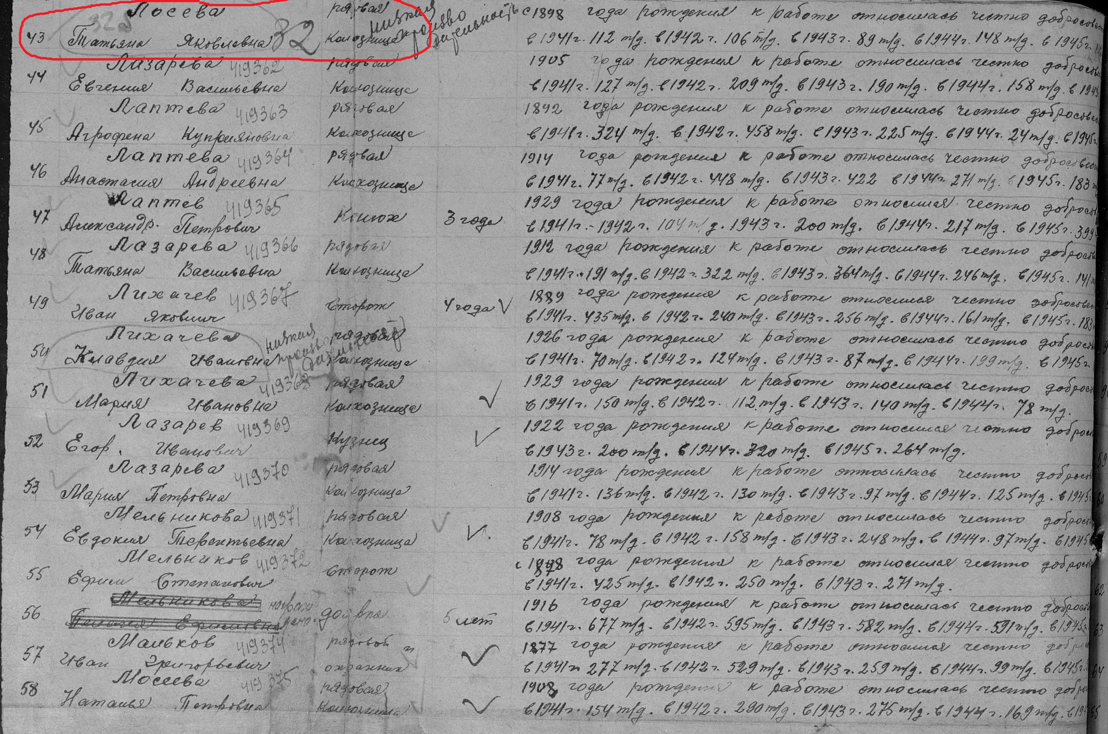Лосева Татьяна Яковлевна родилась в 1898 году. Место жительства: с.Ново-Шешминск Ново-Шешминский район ТАССР. В годы Великой Отечественной войны работала в колхозе «Красный Октябрь» рядовой колхозницей. Награждена медалью "За доблестный труд в Великой Отечественной войне 1941–1945 гг." ( Акт от 28 апреля 1947 г, фонд 3610, опись 2, дело № 325, лист 32).