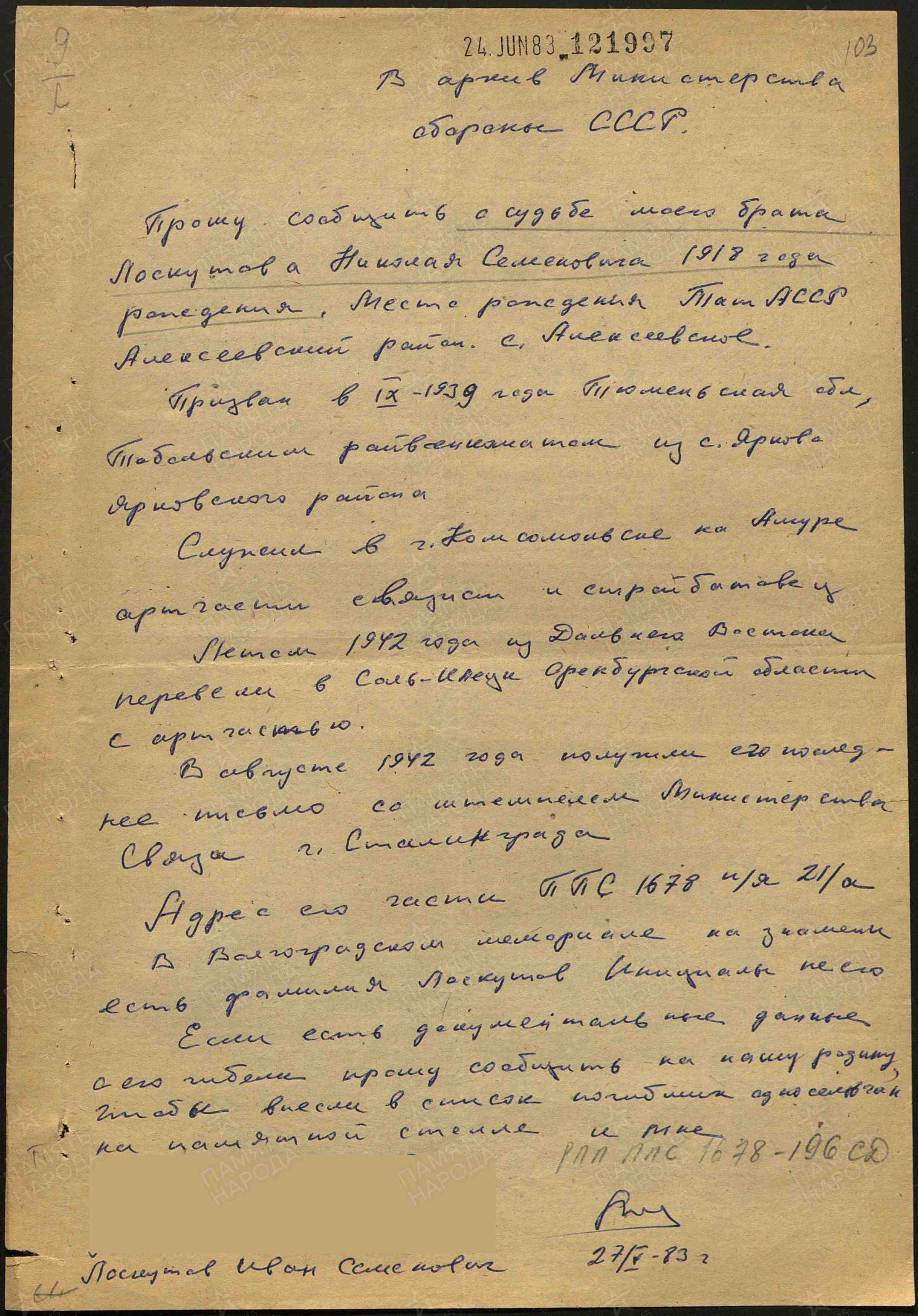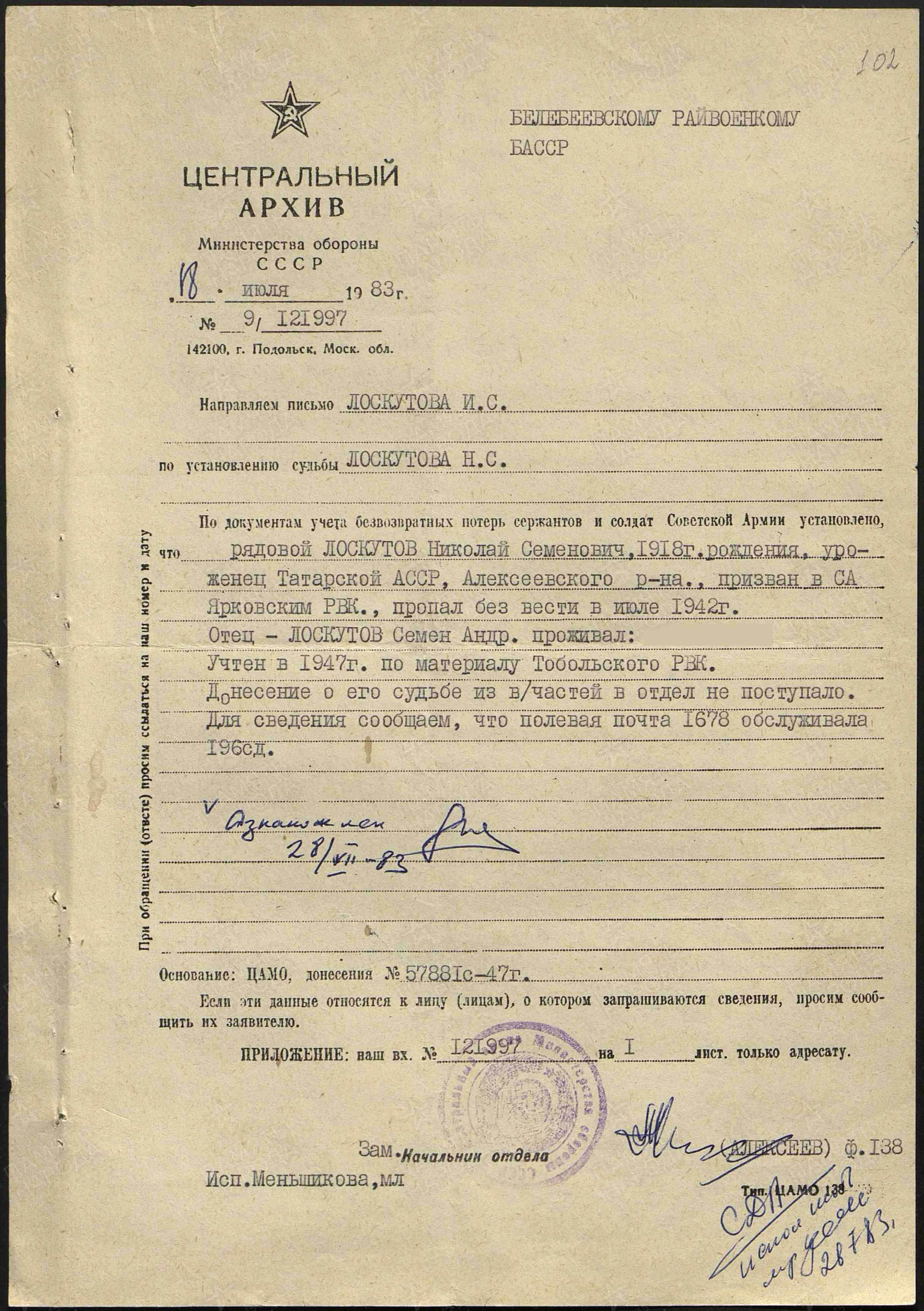 ЛОСКУТОВ Николай Семёнович, 1918, с. Алексеевское. Жил в г. Тобольск. Мобилизован Ярковским РВК Тюменской обл. в сент. 1939. Красноармеец. В 1942 находился в составе 725 АП 196 СД 62 А Сталинградского фронта. Письменная связь прекратилась в июле 1942. Пропал без вести.