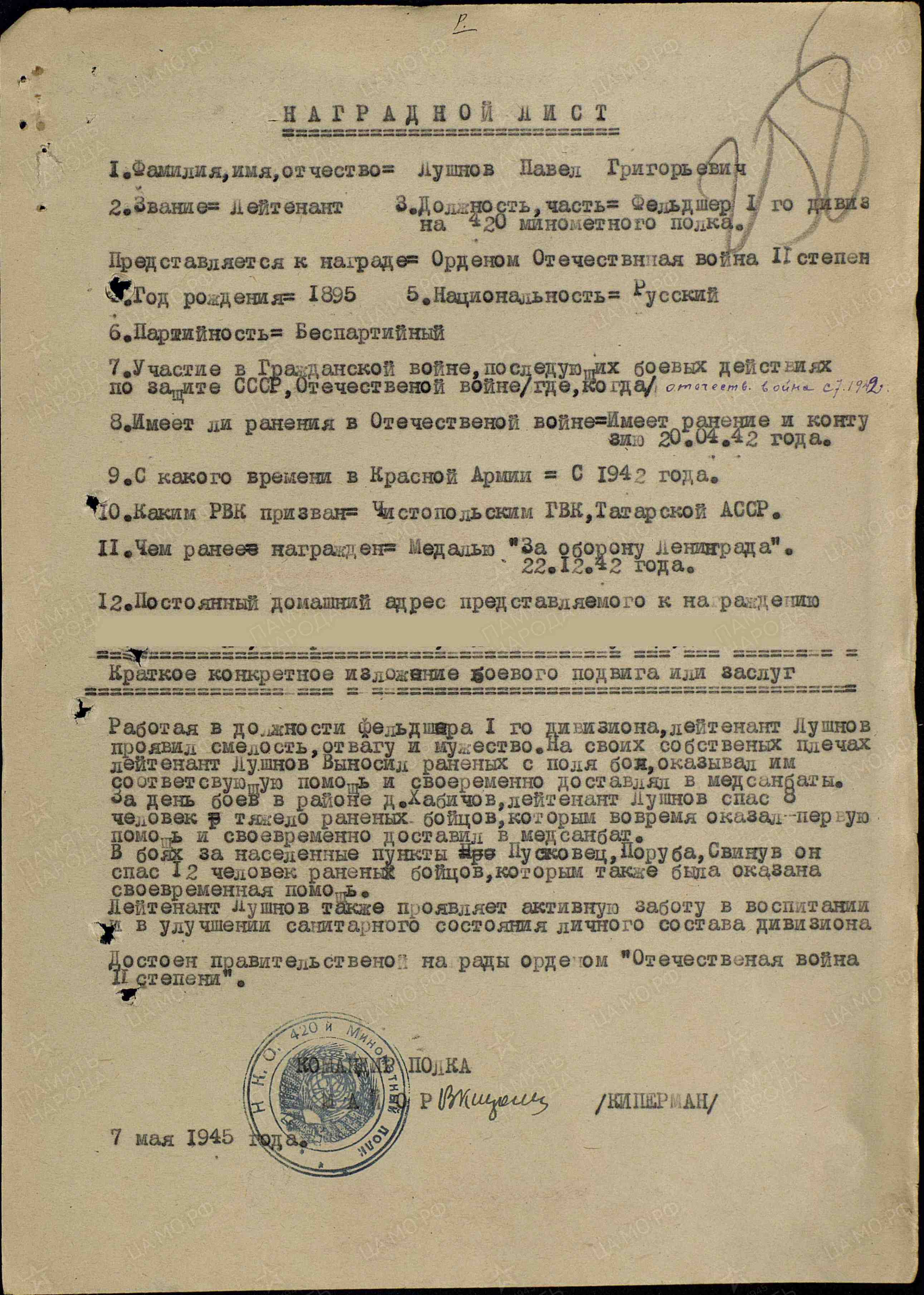 Павел Григорьевич Лушков (Лушнов) родился 26 июня 1895 г. в г.Чистополе, ТАССР. В 1942 г. призван в ряды Красной Армии Чистопольским военным комиссариатом. Служил в звании лейтенанта, в должности фельдшера 1 дивизиона 420 минометного полка. 20 апреля 1942 г. в бою получил ранение и контузию.