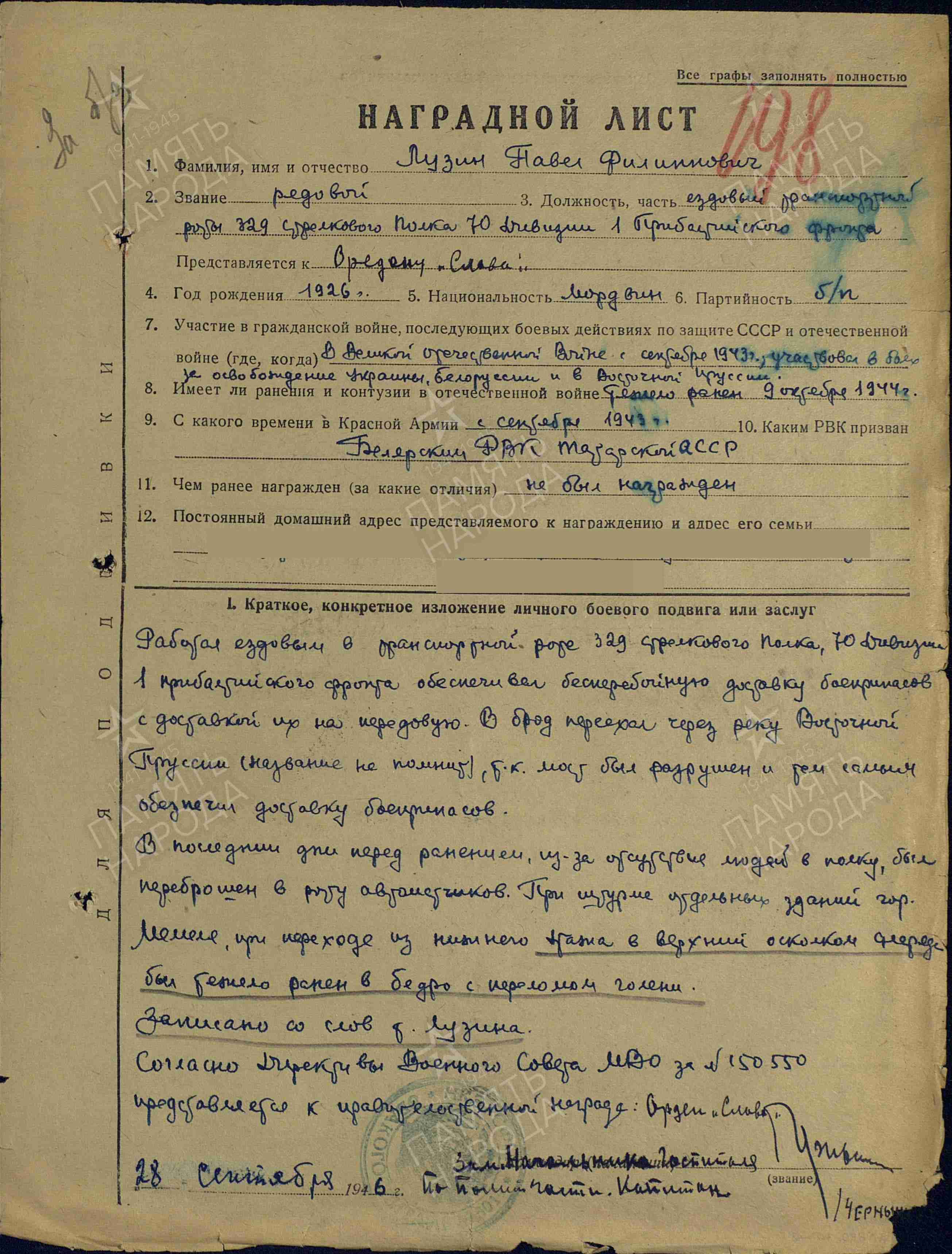 ЛУЗИН Павел Филиппович, 1926, д. Лягушкино. До призыва в армию работал в к-зе «Нацмен». Мобилизован 5 нояб. 1943 Билярским РВК. Воевал на 2 Белорусском, 3 Белорусском, 1 Прибалтийском фронте в составе 33 А/ 43 А. Красноармеец, повозочный транспортной роты, стрелок роты автоматчиков 329 СП 70 СД. Участник освобождения Белоруссии и Прибалтики. 9 окт. 1944 тяжело ранен осколками снаряда в бедро и голень. Более 14 месяцев проходил лечение в госпиталях, ЭГ 5002, г. Москва. После излечения служил в МоскВО. Награждён Указом Президиума ВС ССР от 6 нояб. 1947 медалью «За боевые заслуги». Дальнейшая судьба не выяснена.