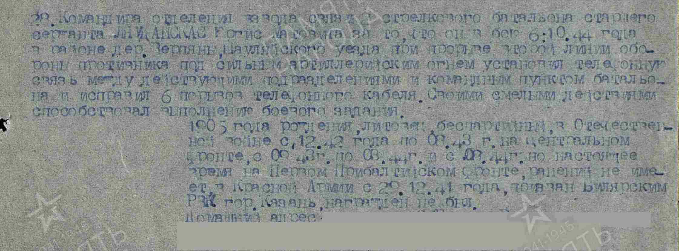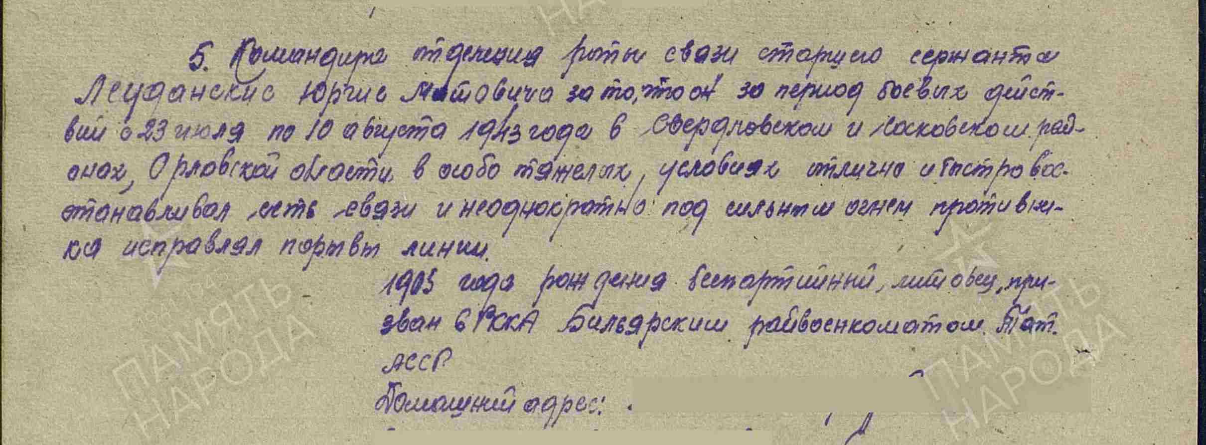 ЛЯУДАНСКАС Юргис Марович, 1905, г. Рокишкис (Ракишки), Ковенская губ. (Литва). С 1941 – в эвагуации. Мобилизован Билярским РВК 29 дек. 1941. На фронте с дек. 1942. Ст. сержант, ком. отделения роты связи 249 СП 16 СД 2 гв. А Центрального/ 1 Прибалтийского фронта. Награждён двумя медалями «За отвагу». Убит 16 окт. 1944, Литовская ССР, Таурагский уезд. Тело оставлено на предполье обороны противника.
