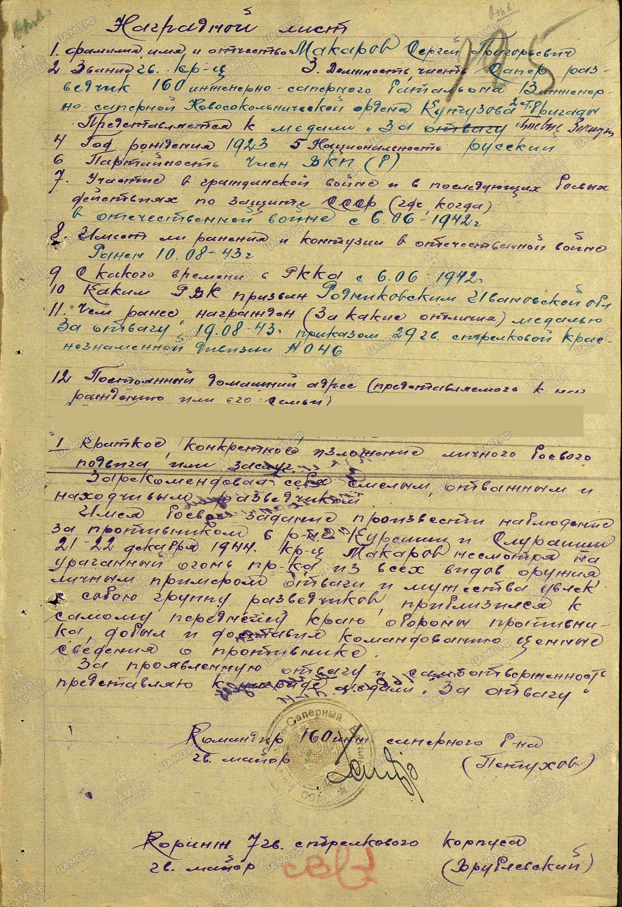 Сергей Григорьевич Макаров, 1923 года рождения, призванный в 1941 году, принял присягу 15 июля 1942 года. 360-ый запасной стрелковый полк ожидал пополнение. Прибыли сибиряки, и, соединившись, были направлены на передовую в район Можайска. В свои девятнадцать неполных лет он стал сапером 32-го отдельного батальона. Под огнем врага вместе с боевыми друзьями днем и ночью разминировал поля, дороги и разные объекты, прокладывая путь 29-ой гвардейском дивизии по направлению к Вязьме.