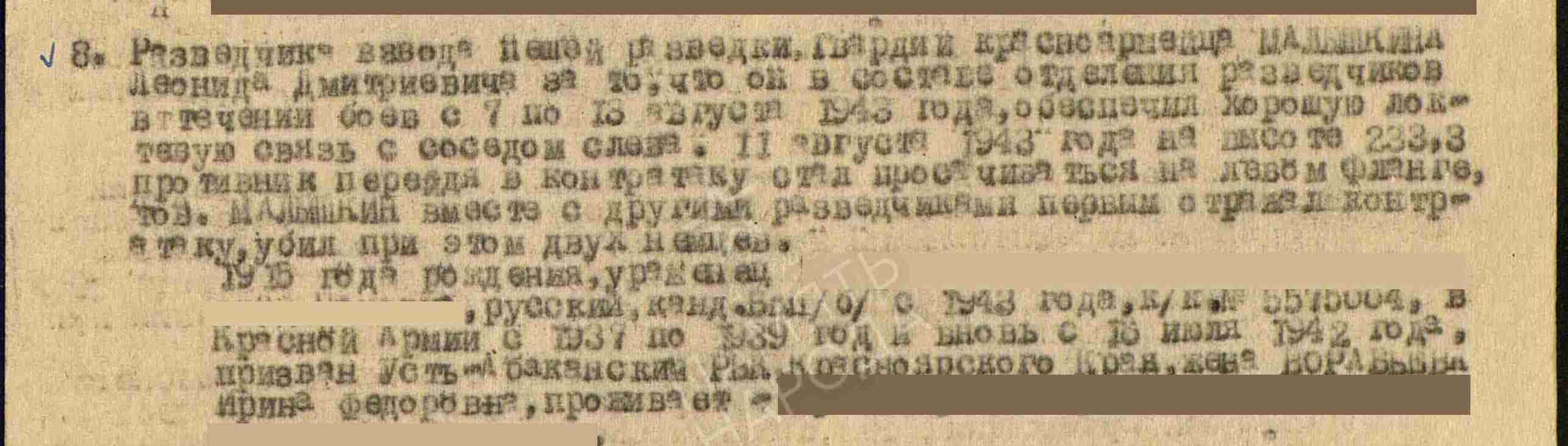 МАЛЫШКИН Леонид Дмитриевич, 1915, д. Пановка. В 1937-1939 проходил срочную службу в РККА. Мобилизован Усть-Абаканским РВК, Хакасская АО, Красноярский край,16 июля 1942. Гв. красноармеец, разведчик взвода пешей разведки 259 гв. СП 65 гв. СД 10 гв. А Западного и 2 Приб. фронта. Награждён медалями «За боевые заслуги», «За отвагу». Погиб 18 июля 1944, д. Брянцево (п. Красногородское), Опочецкий р-н, Псковская обл.