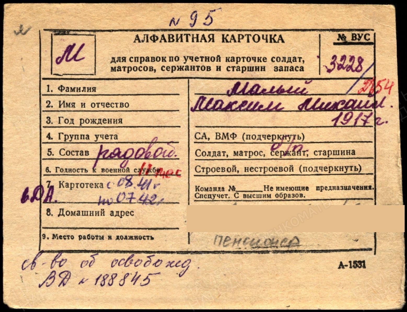 Ранен в голову летом 1941 г., в левый пах осколком мины (два осколка не вынули) в Карело-Финской ССР перед линией Маннергейма. На излечении находился в г. Глазово Удмуртской АССР более 3-х месяцев.