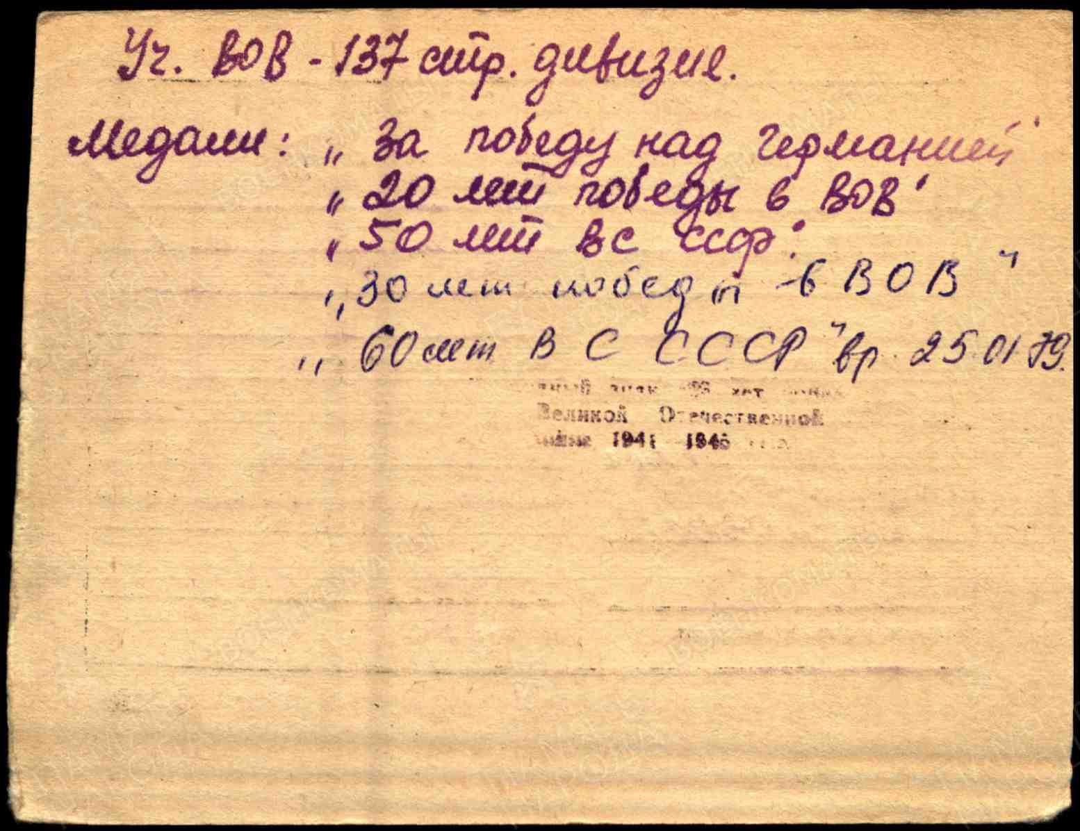В Великой Отечественной войне участвовал с 08.1941 по 07.1942 г. пулеметчик 137 стрелкового полка Ленинградский фронт.
